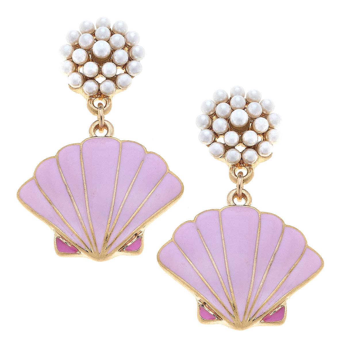 CANVAS Style x @thelovelyflamingo Enamel Scallop Shell Pearl Cluster Drop Earring in Pink