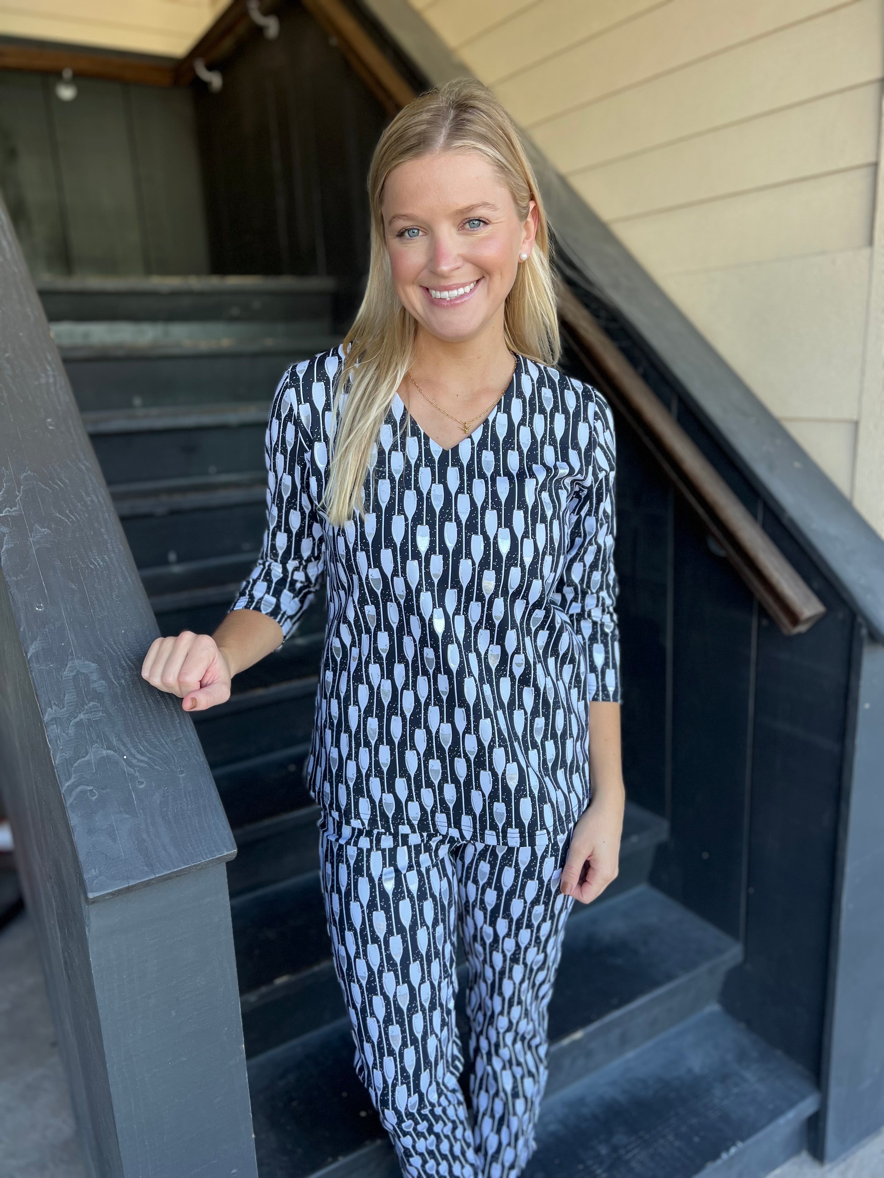 Cir Geo Blu/Emld 3/4 Slv Collar VNeck
