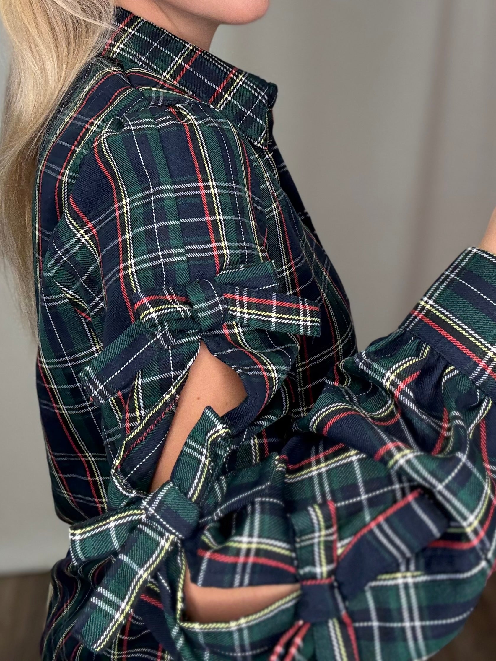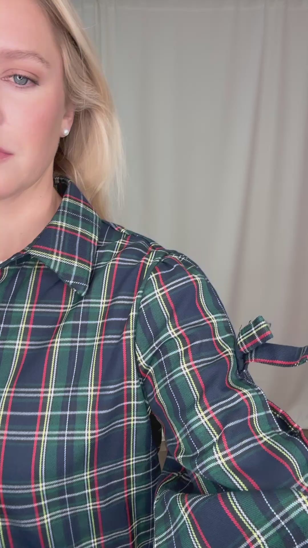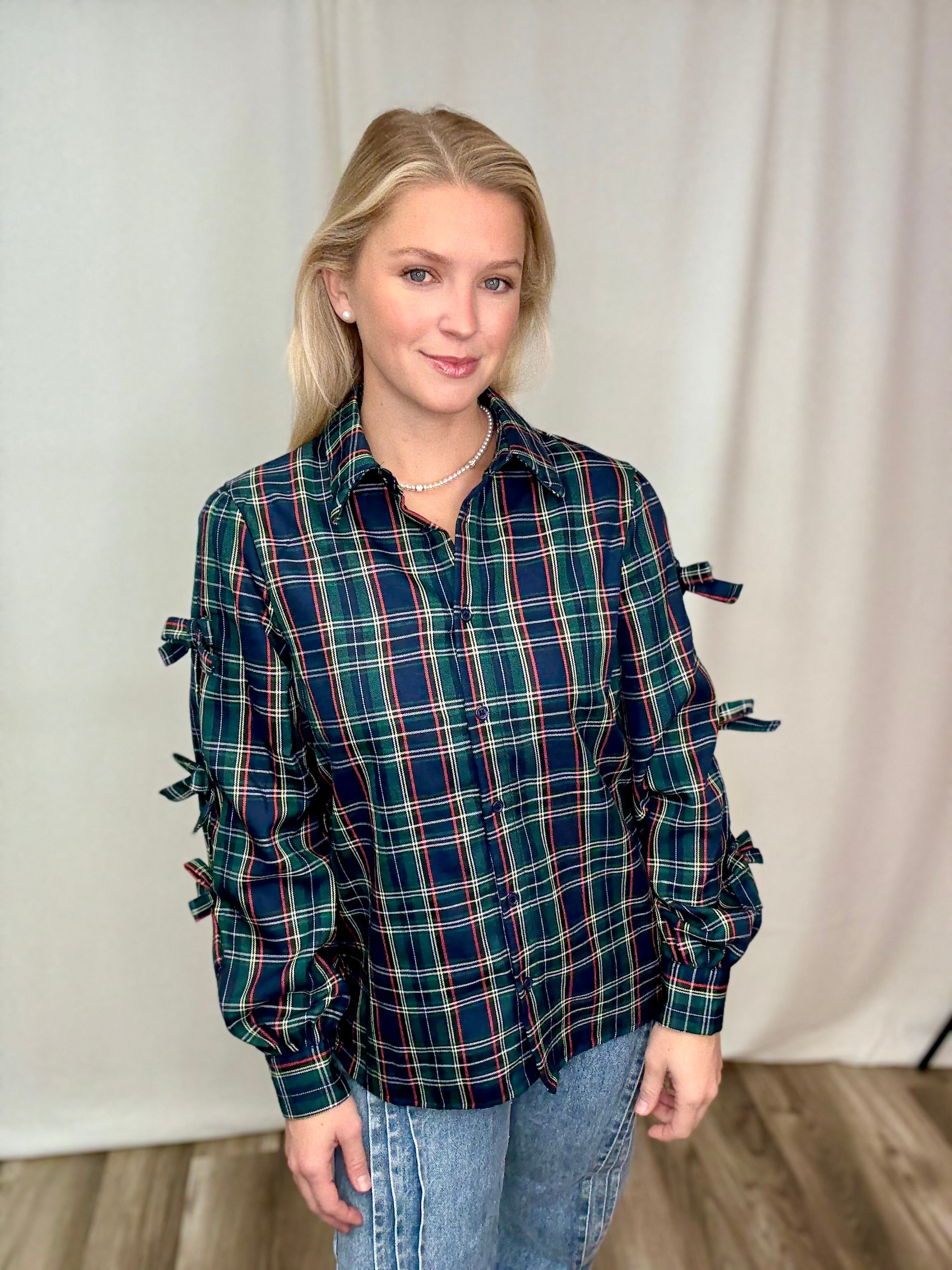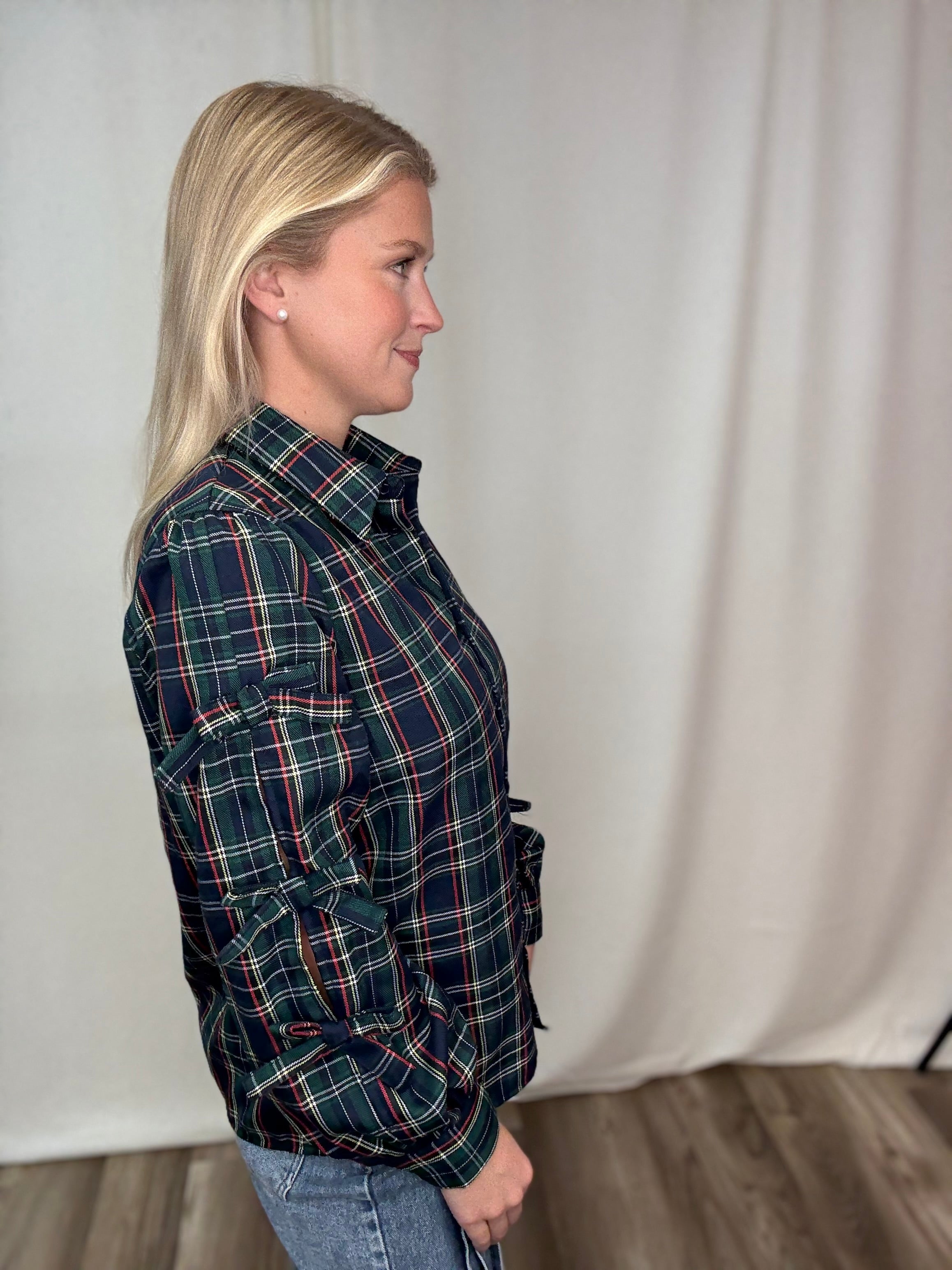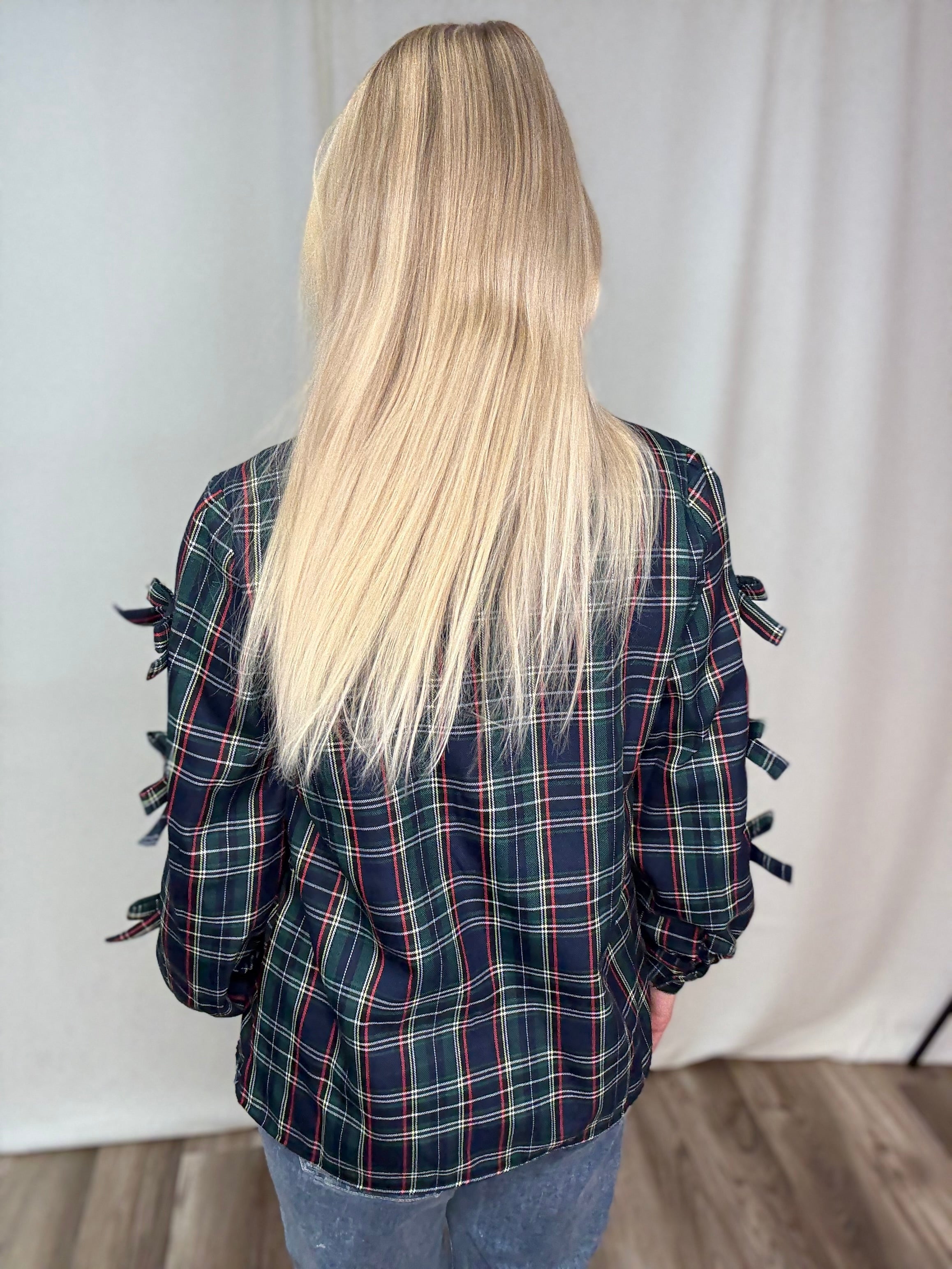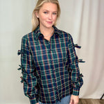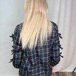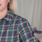 Bow Accent Puff Sleeve Collared Neck Plaid Shirt