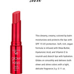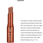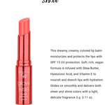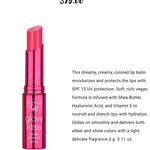 This dreamy, creamy, colored lip balm moisturizes and protects the lips with SPF 15 UV protection. Soft, rich, vegan formula is infused with Shea Butter, Hyaluronic Acid, and Vitamin E to nourish and drench lips with hydration. Glides on smoothly and delivers both sheer and shine colors with a light, delicate fragrance.3 g. 0.11 oz.