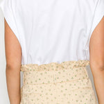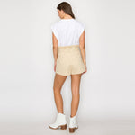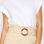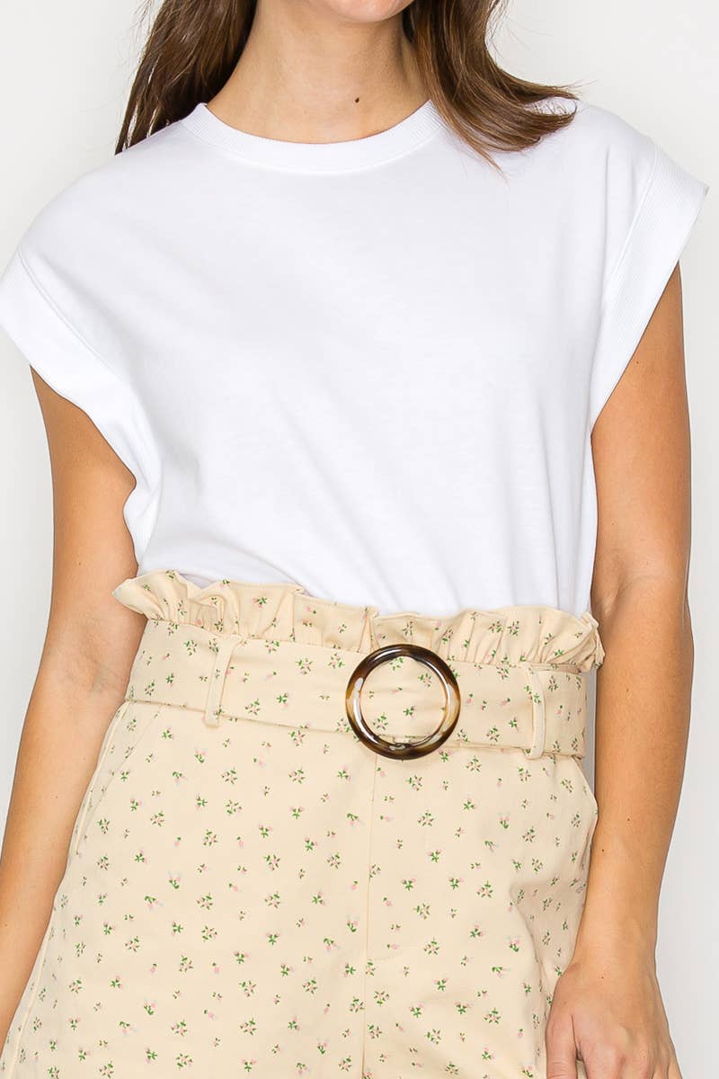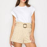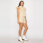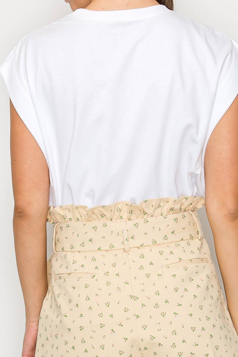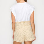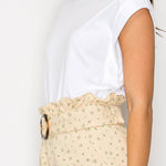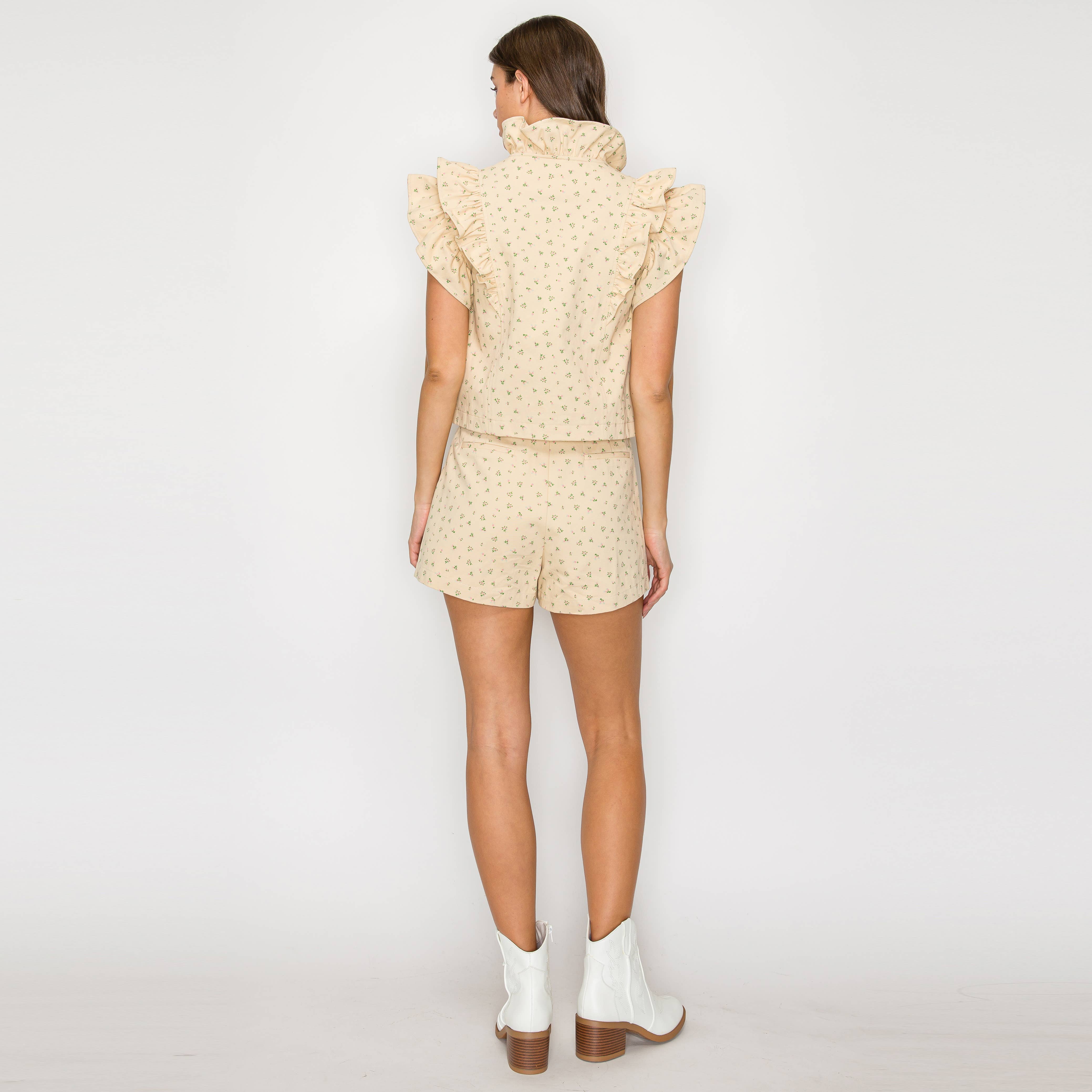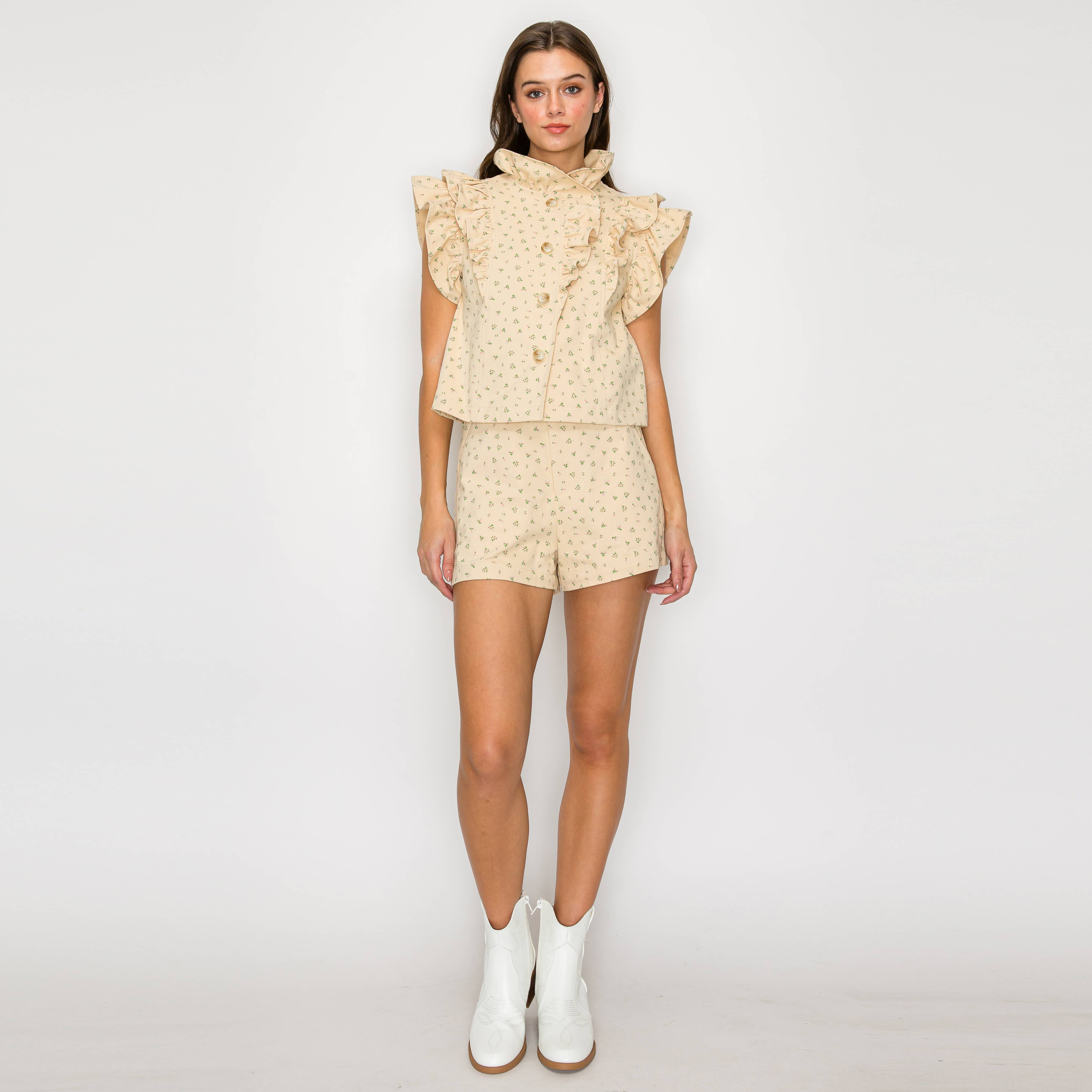 - Little wildflower print twill - Soft tan ground color - Shopper bag detail shorts - Self-ruffle detail on waistband - Self-fabric belt with buckle - Pockets - High waist - Perfect with boots or booties, or sneakers - All-season wearable - STYLE # - LWP1286 * INSEAM - 2 1/2" SELF - 100% COTTON