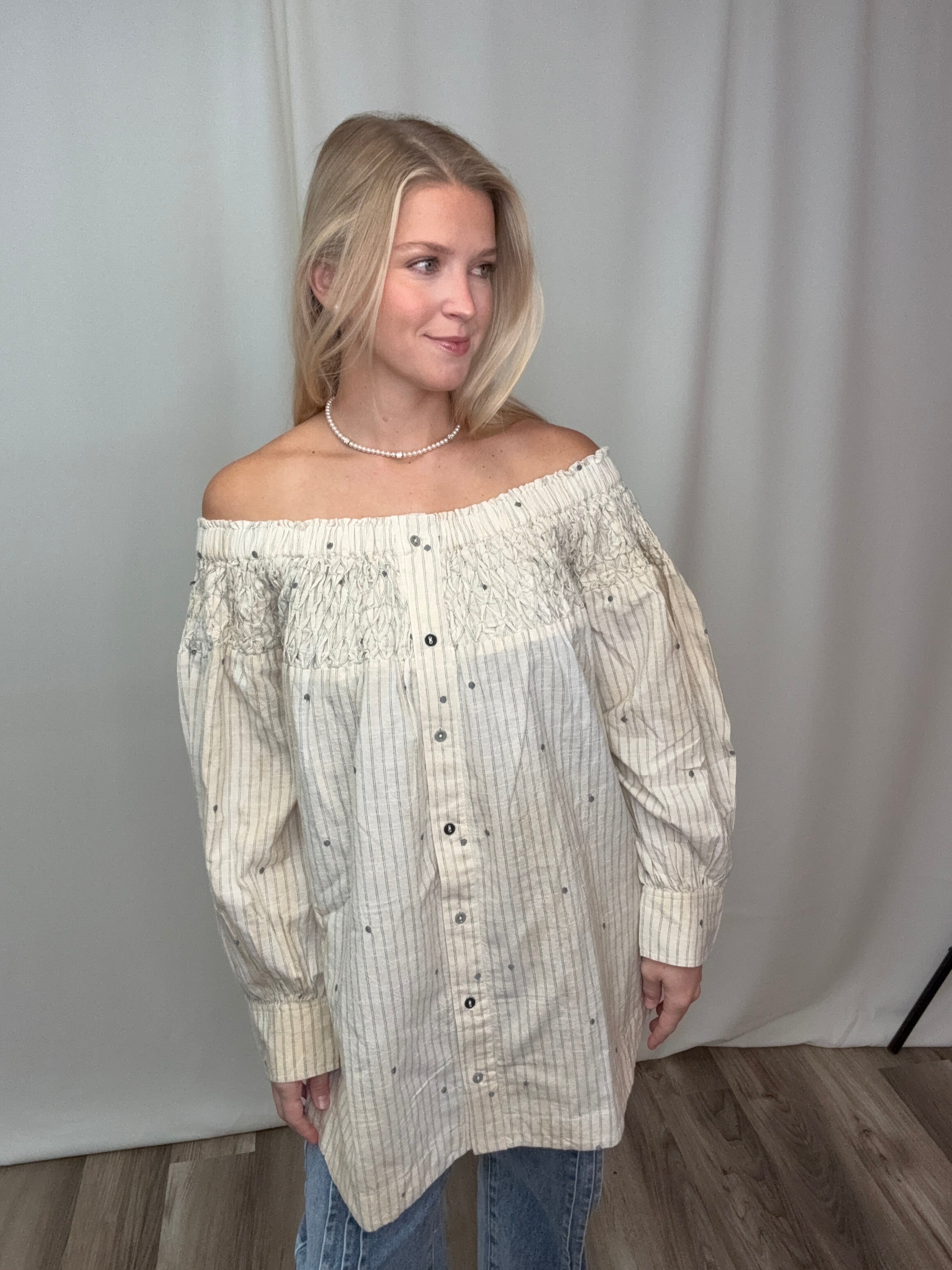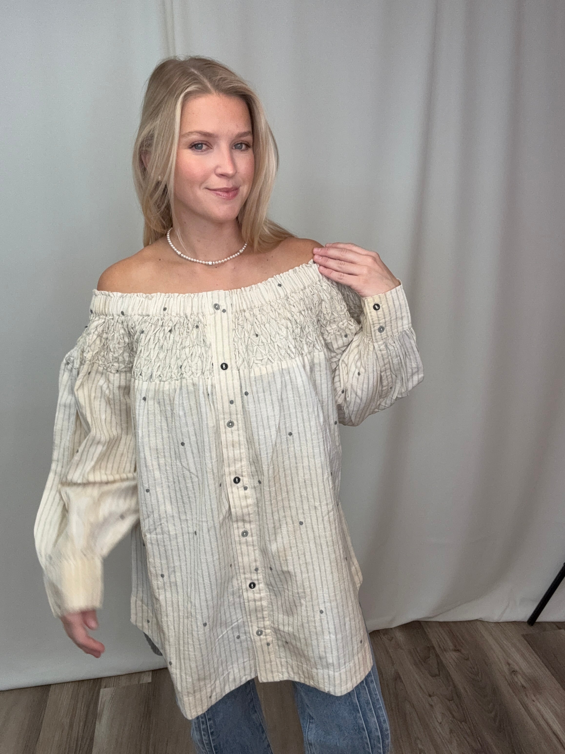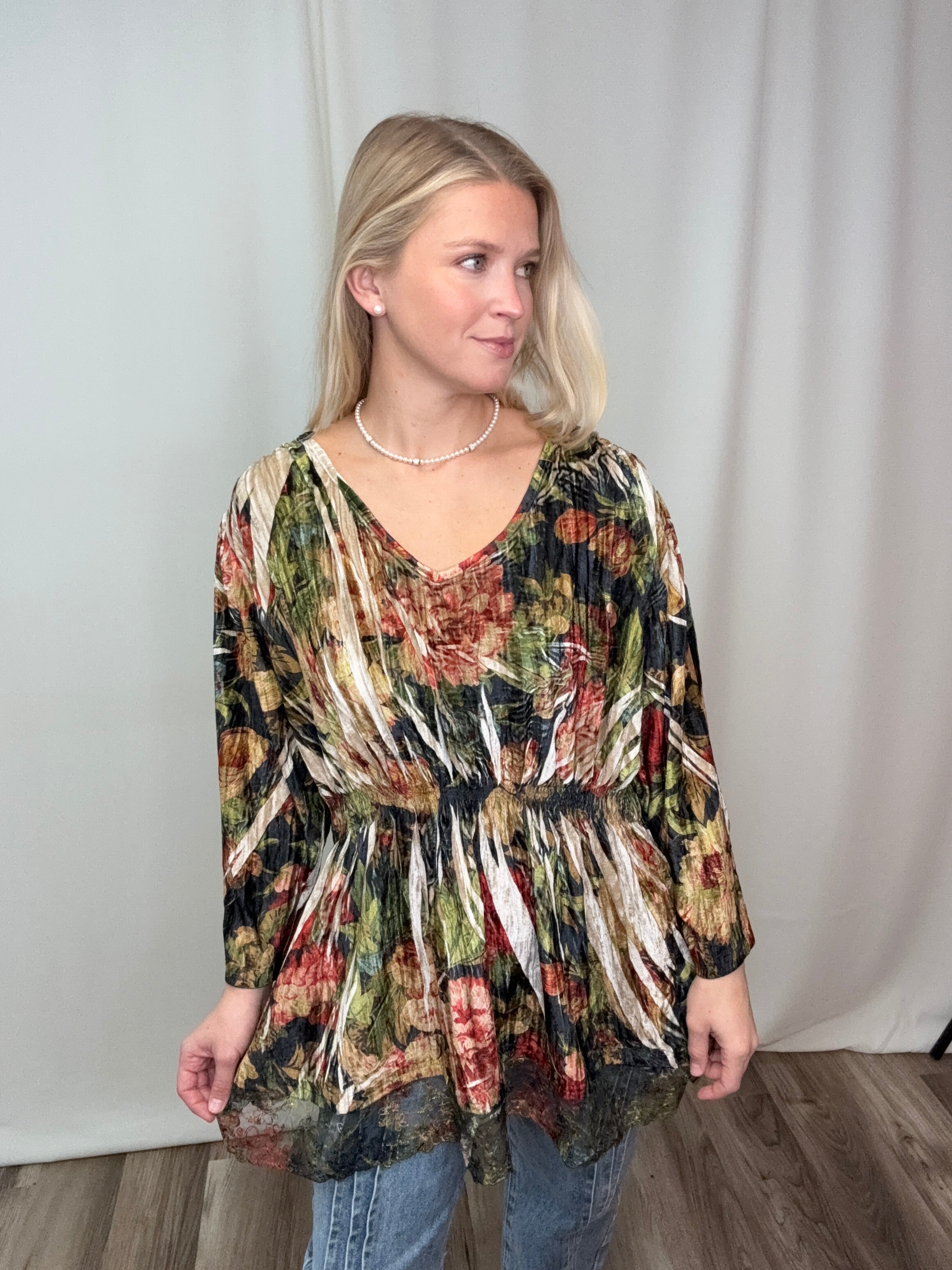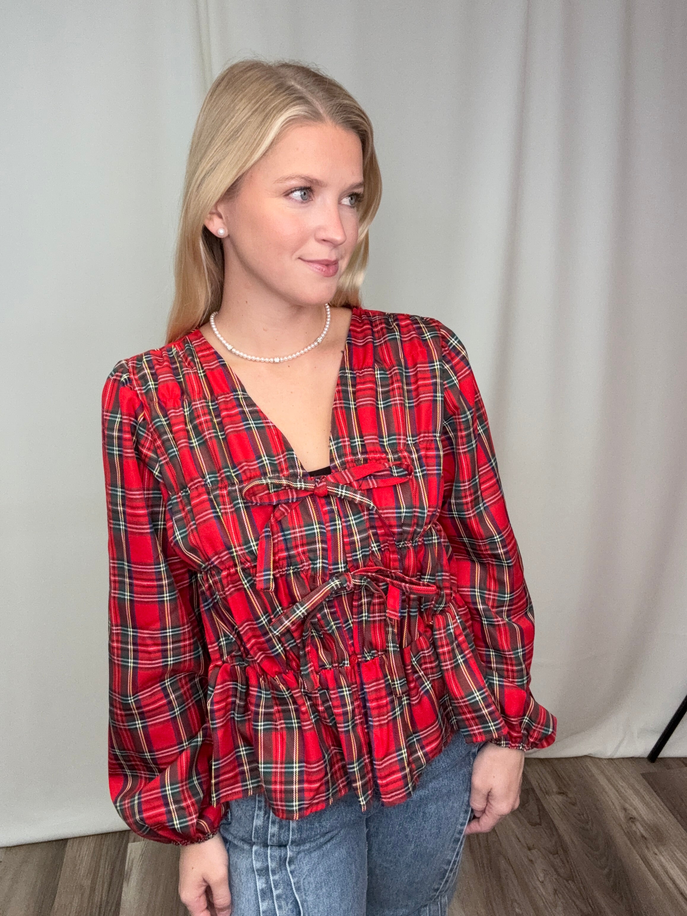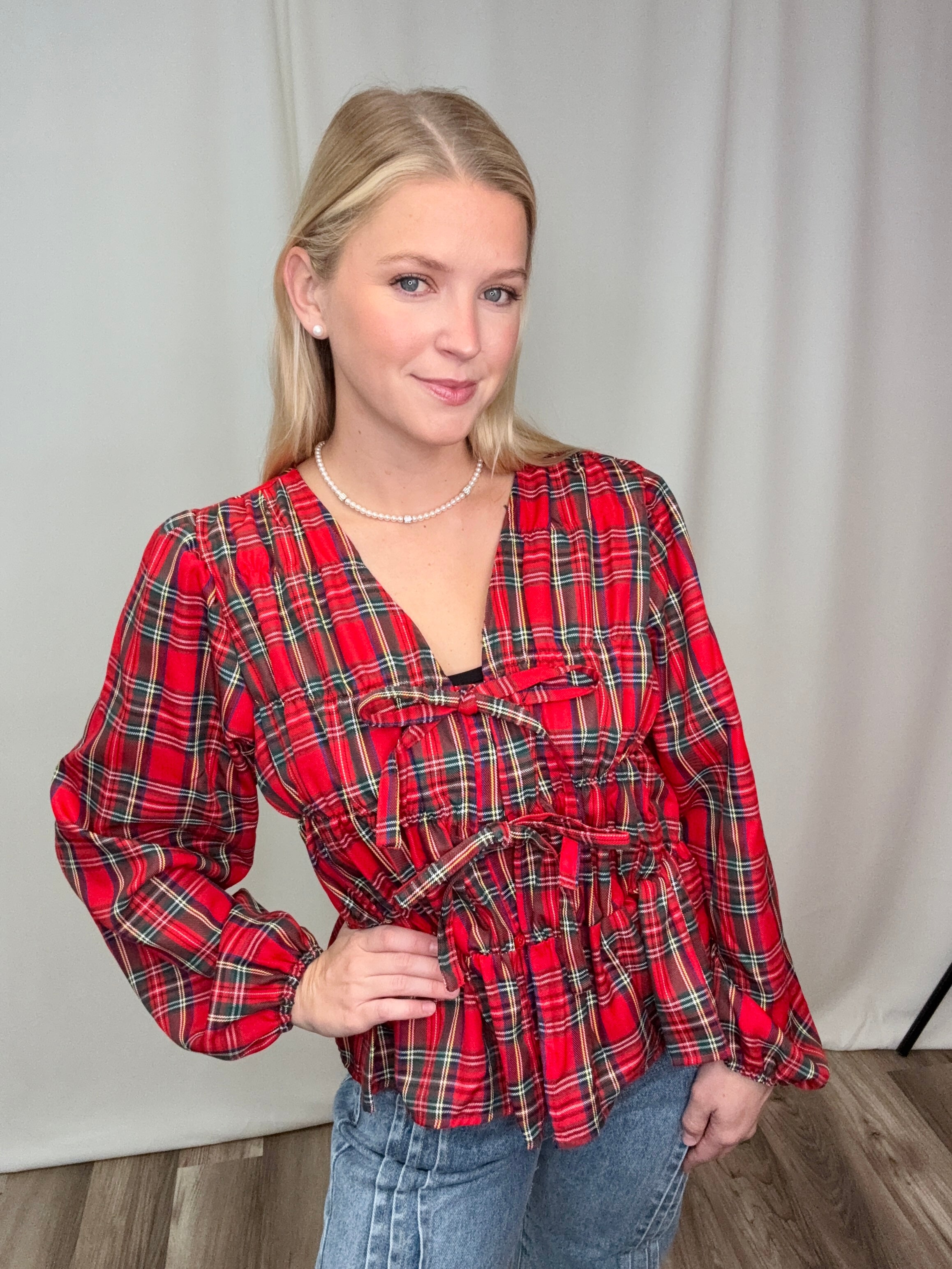 Front Elastic Shirring & Tie Plaid Blouse Top