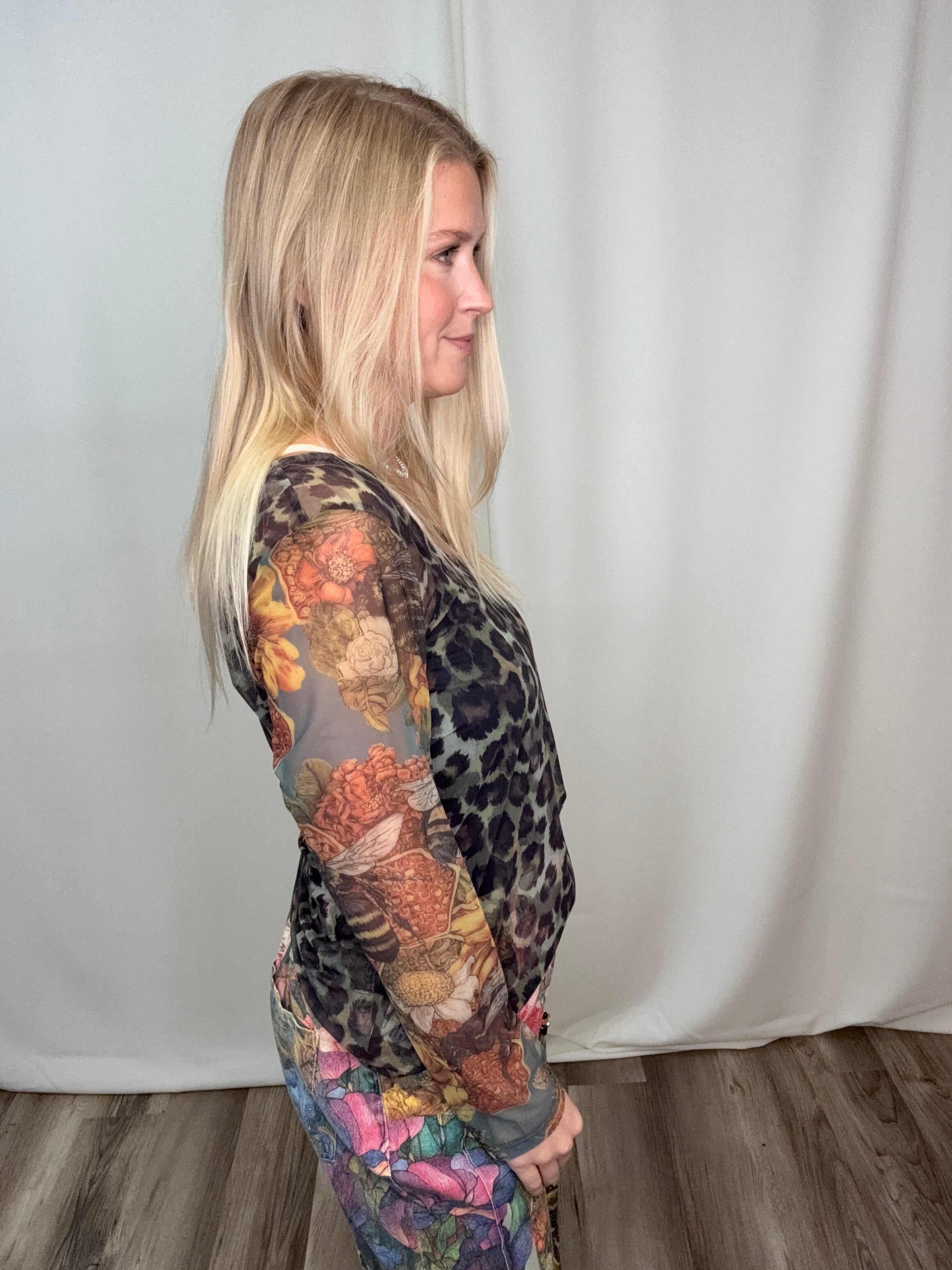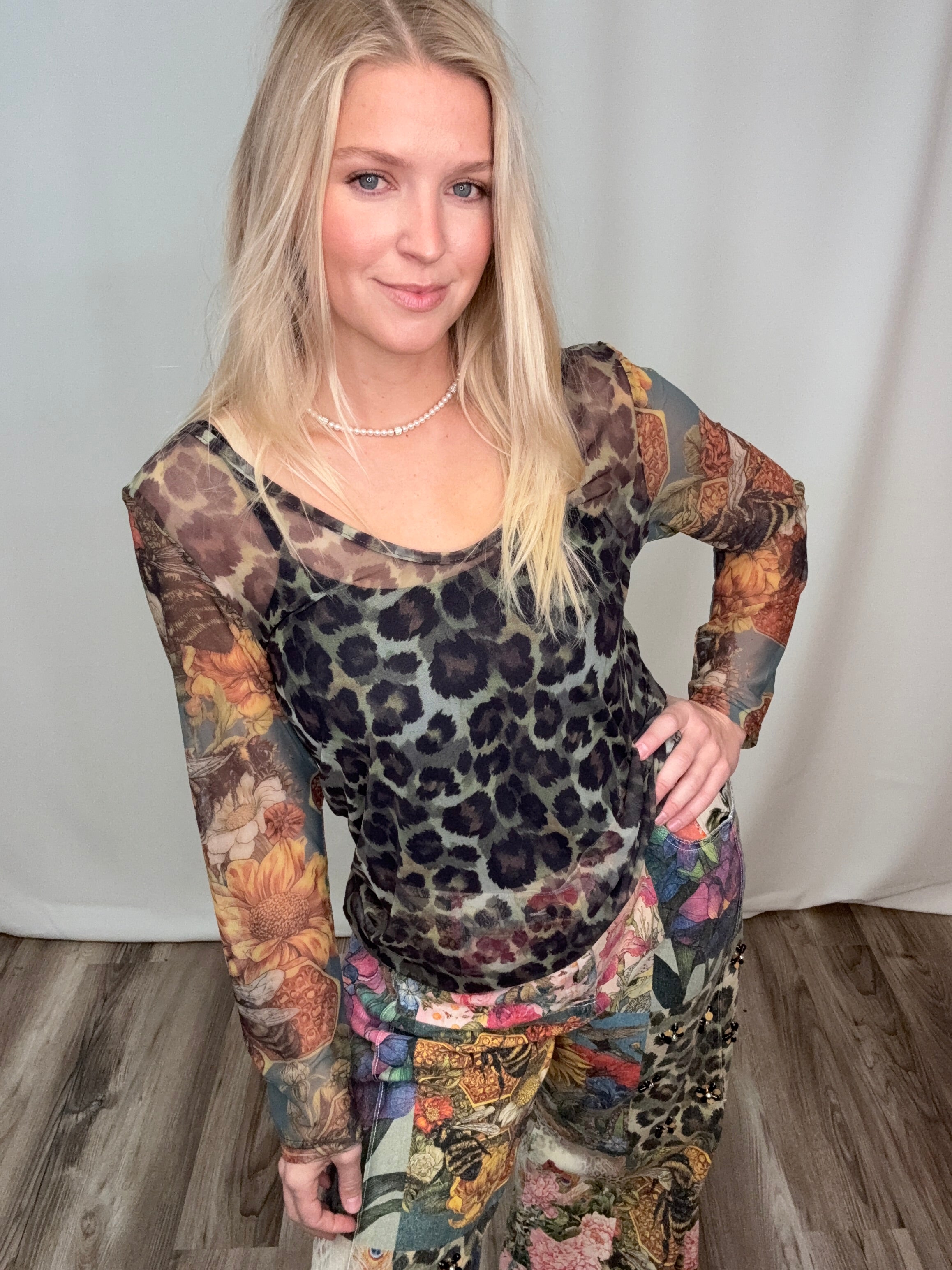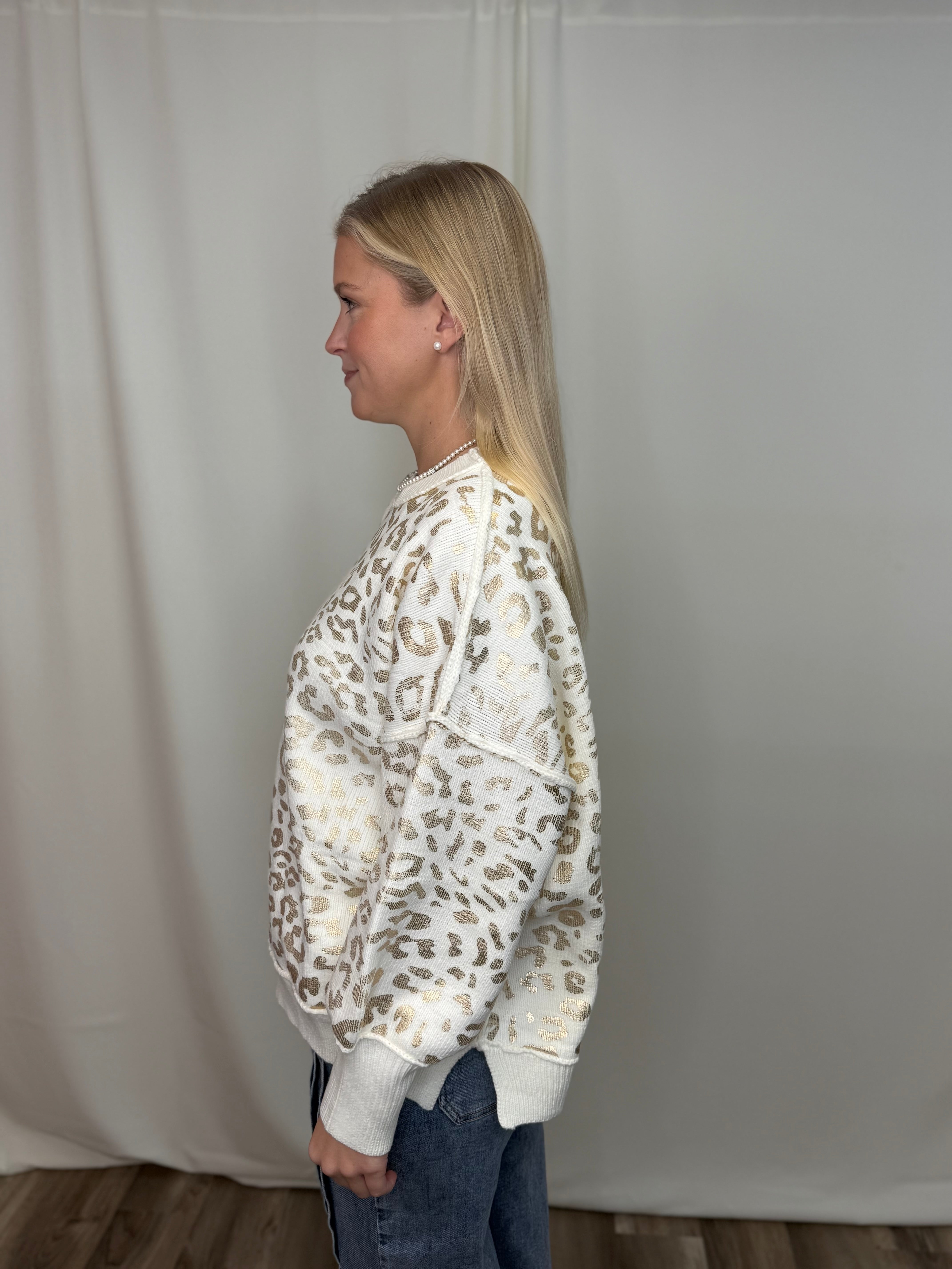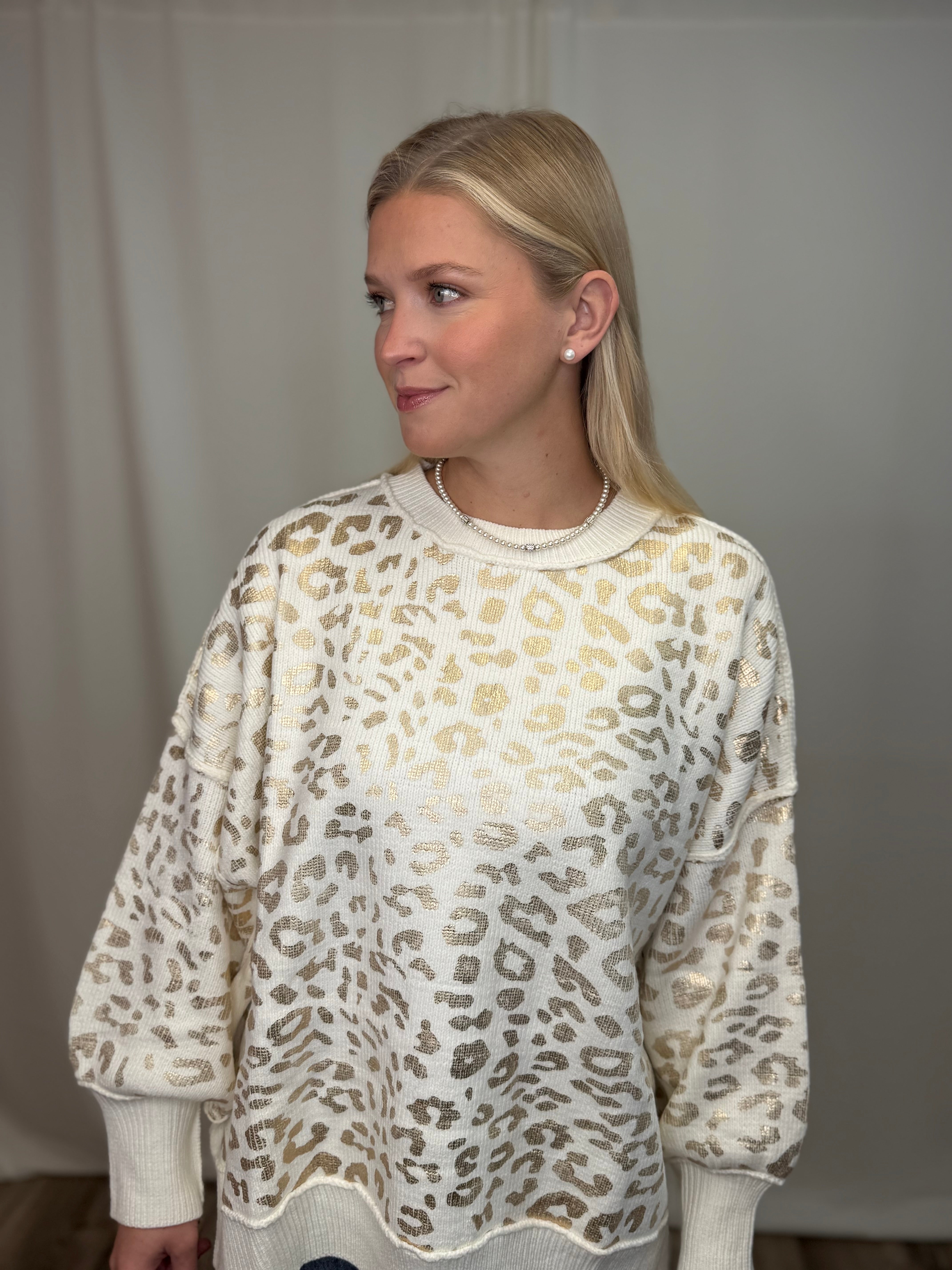 Leopard Foil Print Crew Neck Knitted Sweater Top