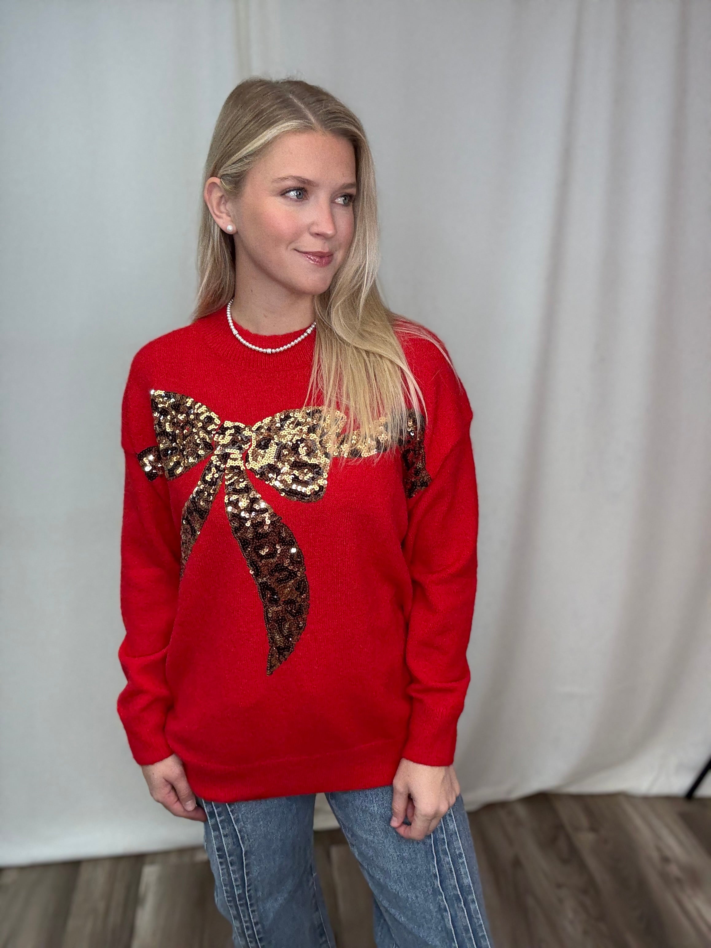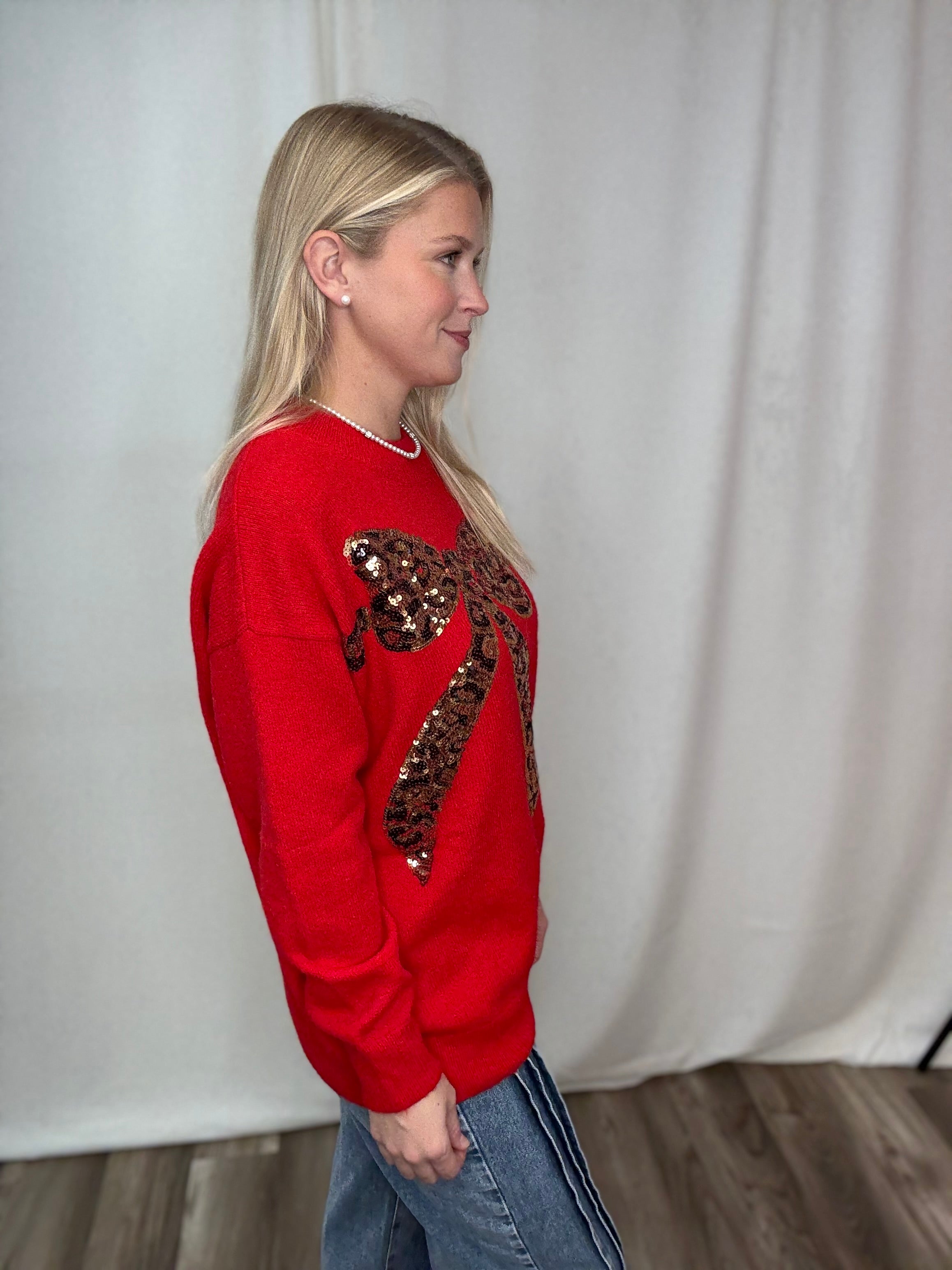 Leopard Sequin Bow Crew Neck Knitted Sweater Top