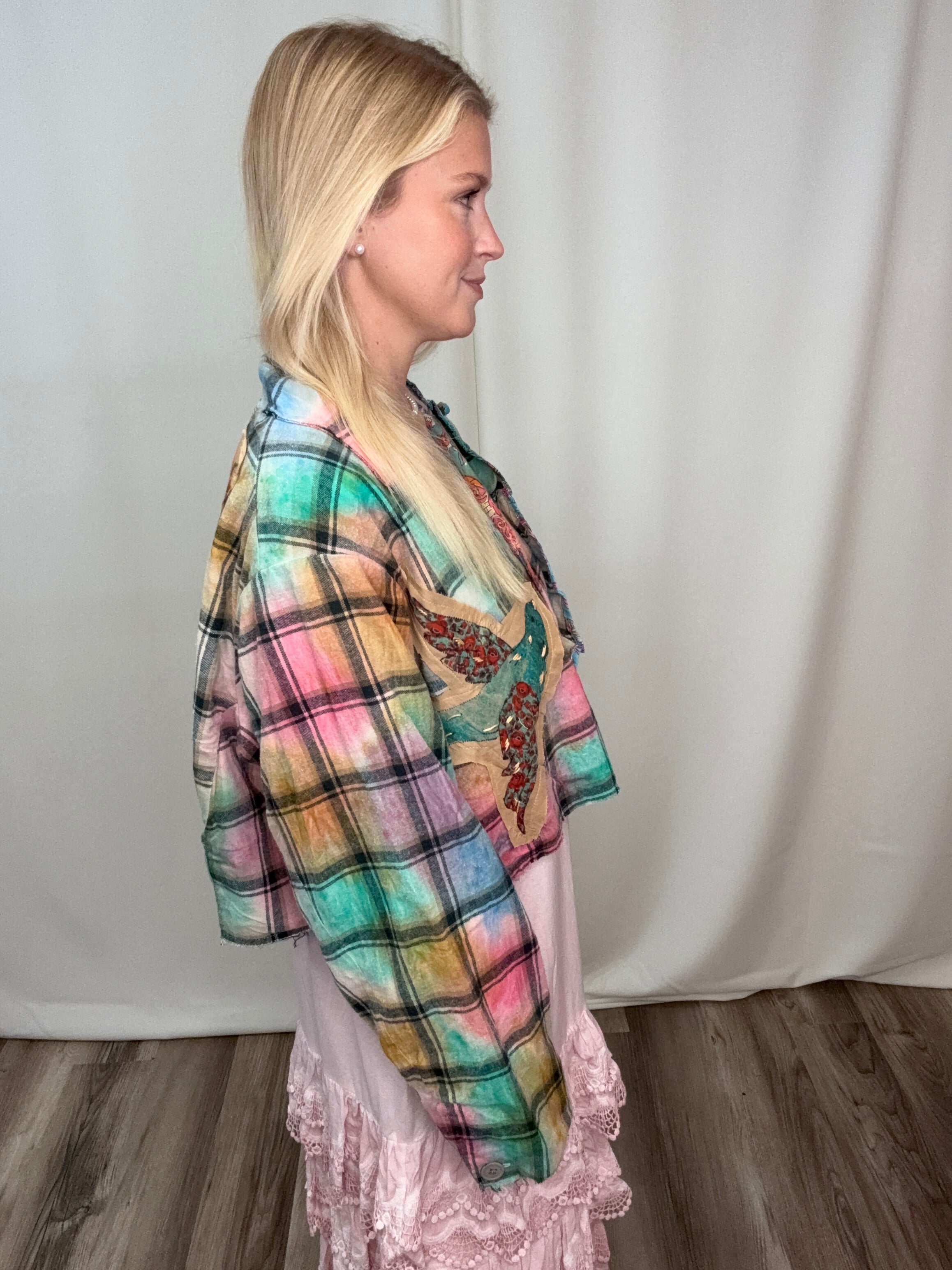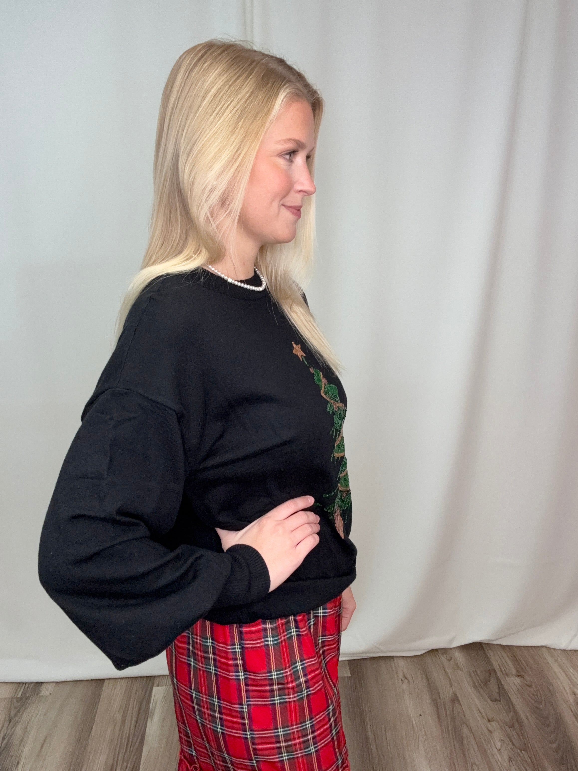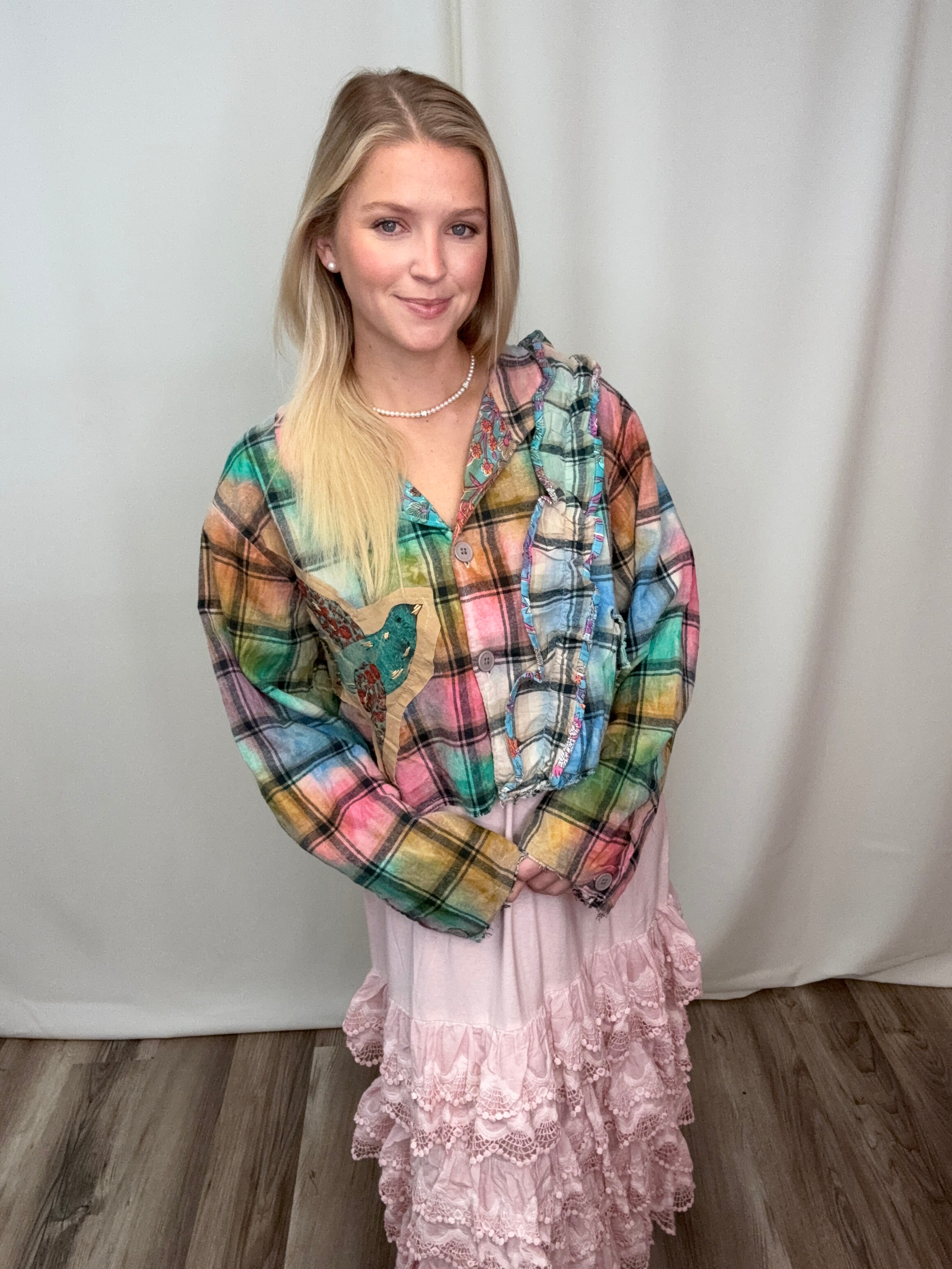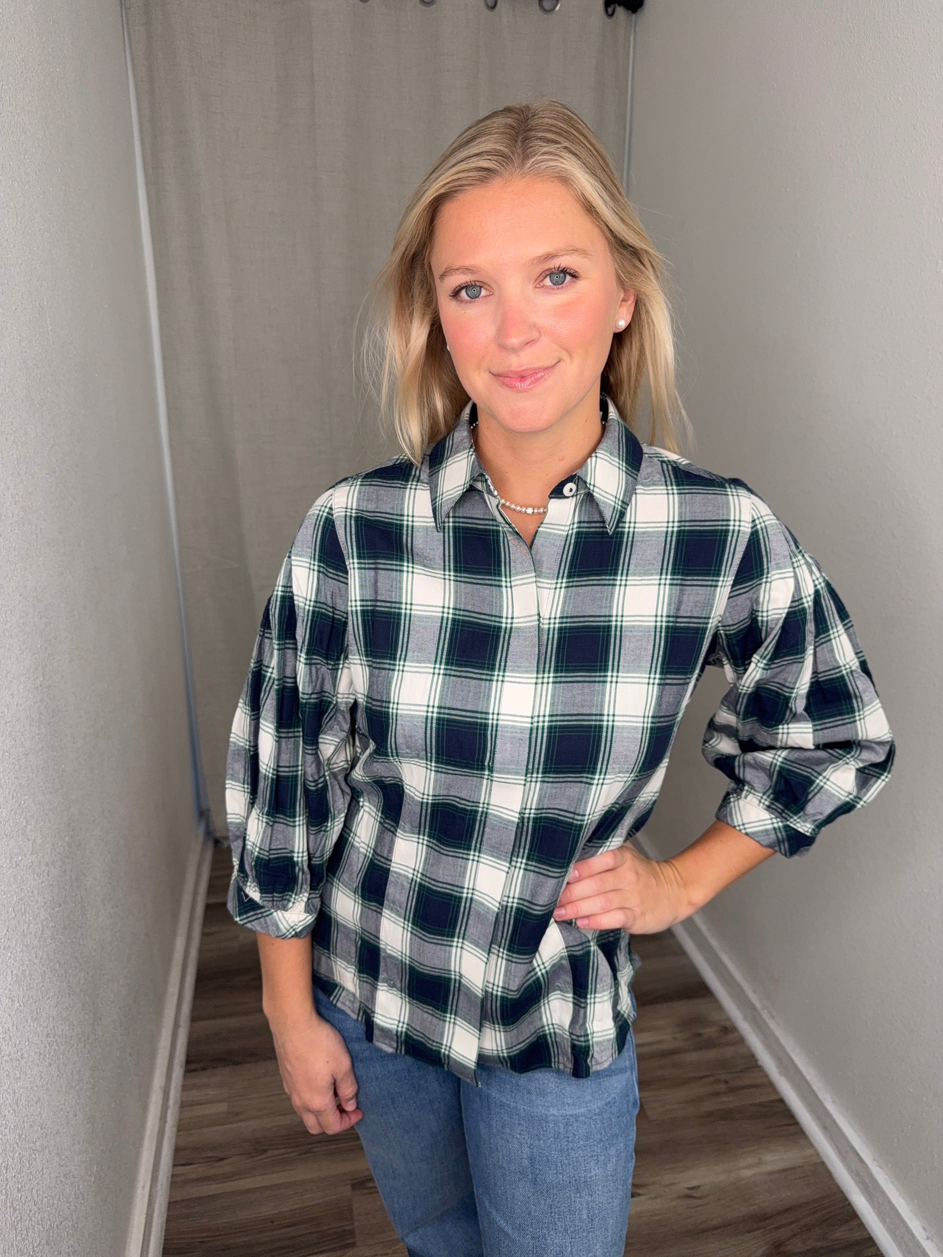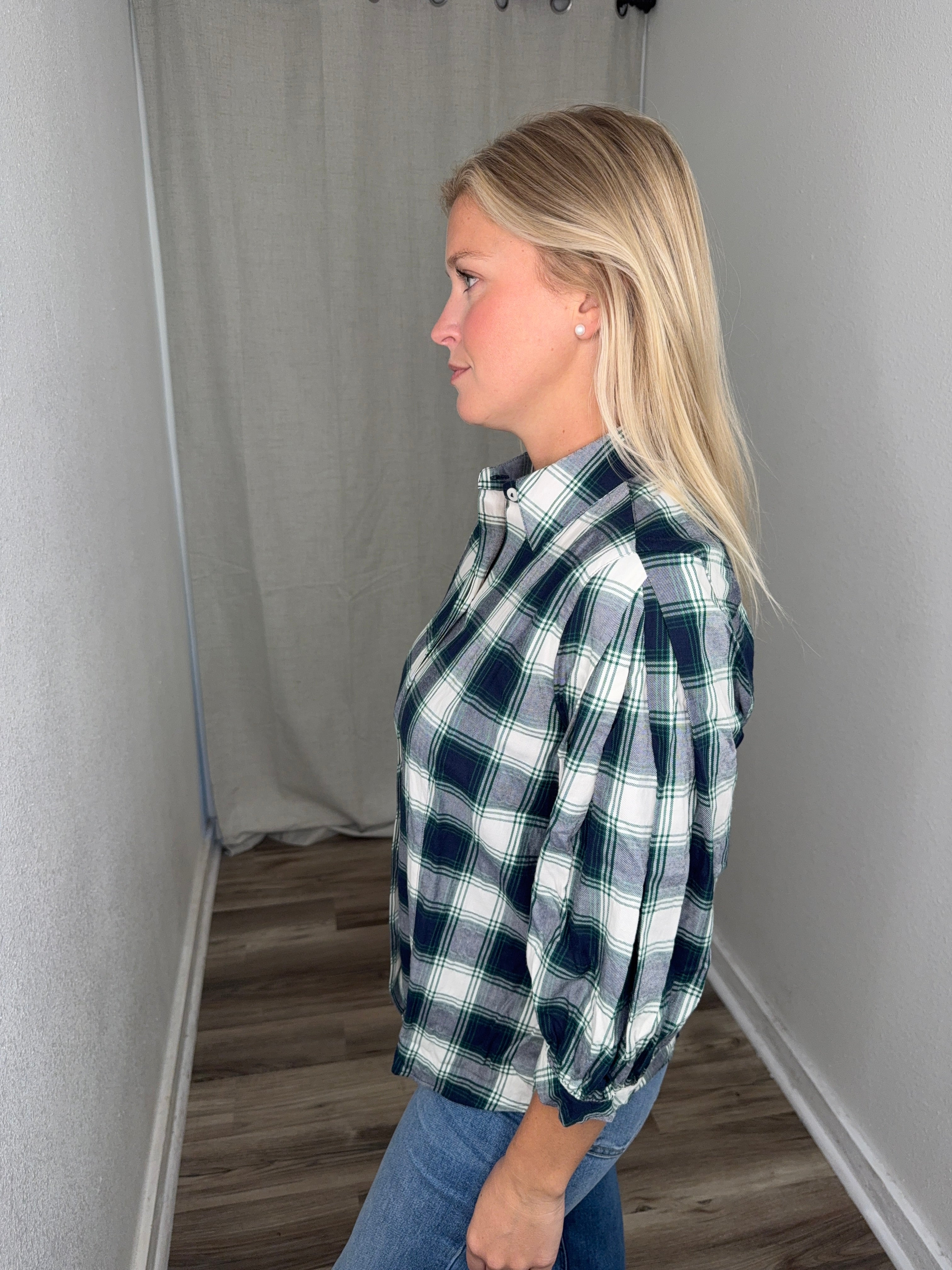 Bow Accent Puff Sleeve Collared Neck Plaid Shirt