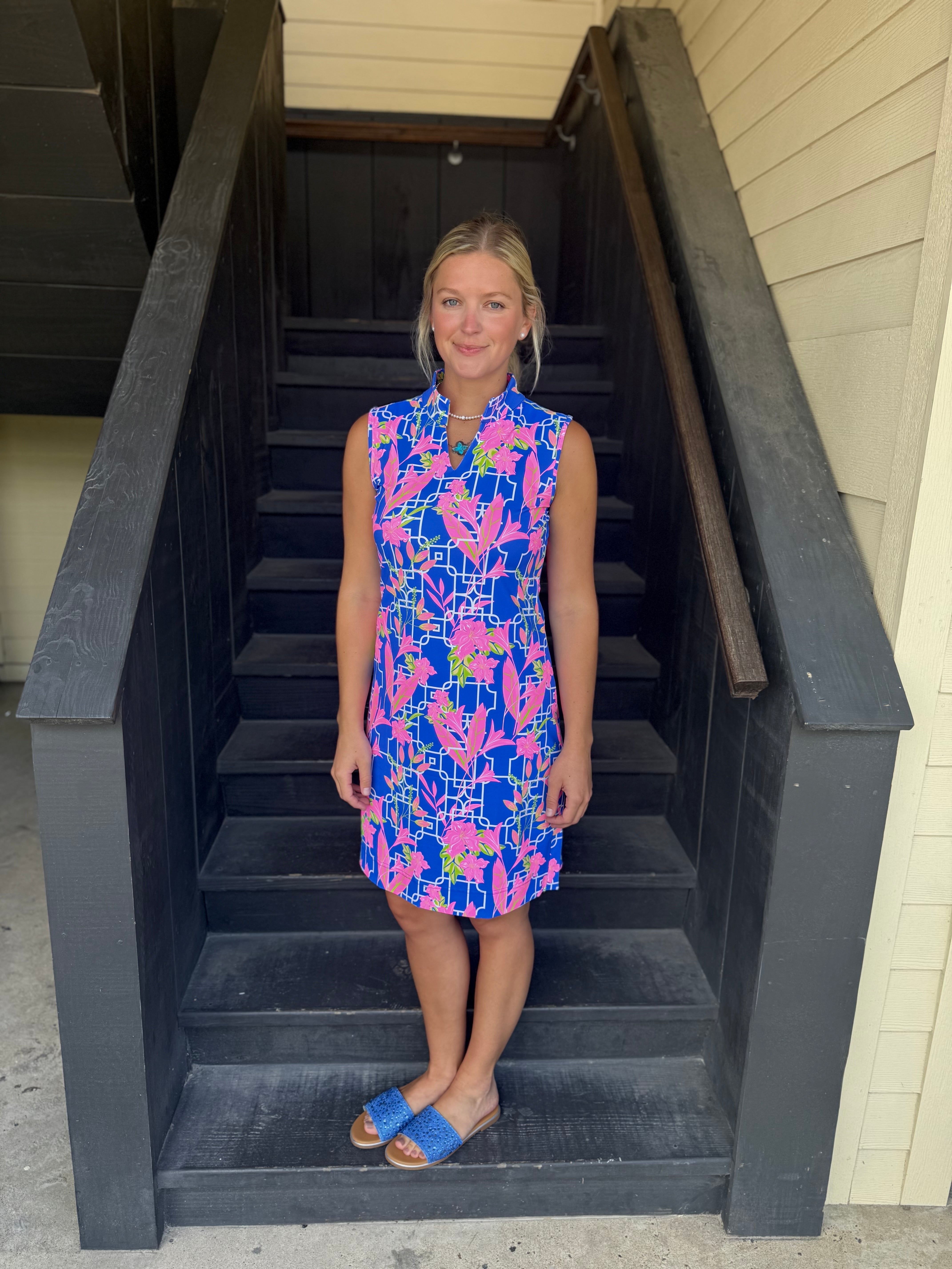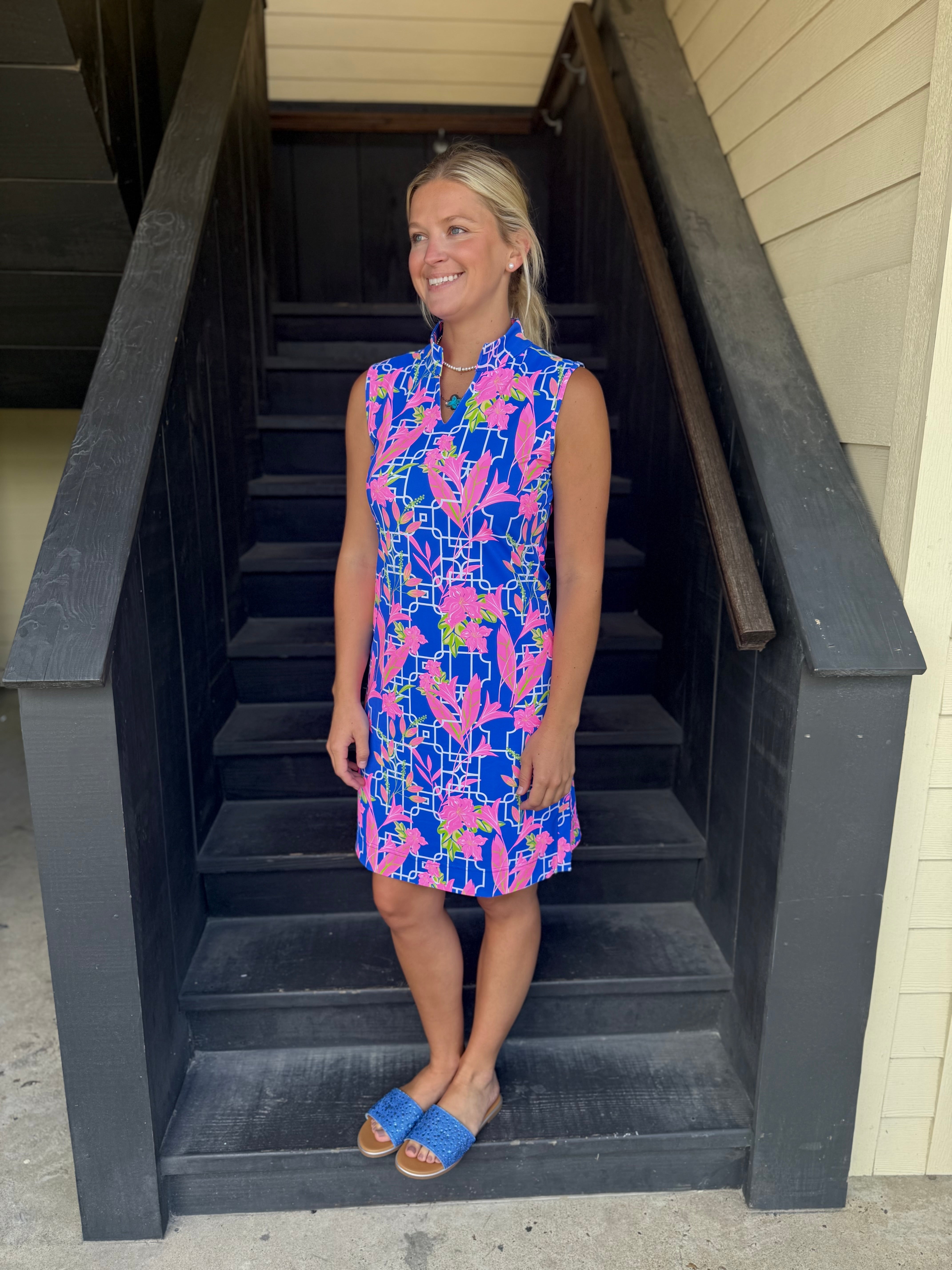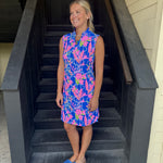 Blue and Pink Floral Sleeveless Keyhole Dress