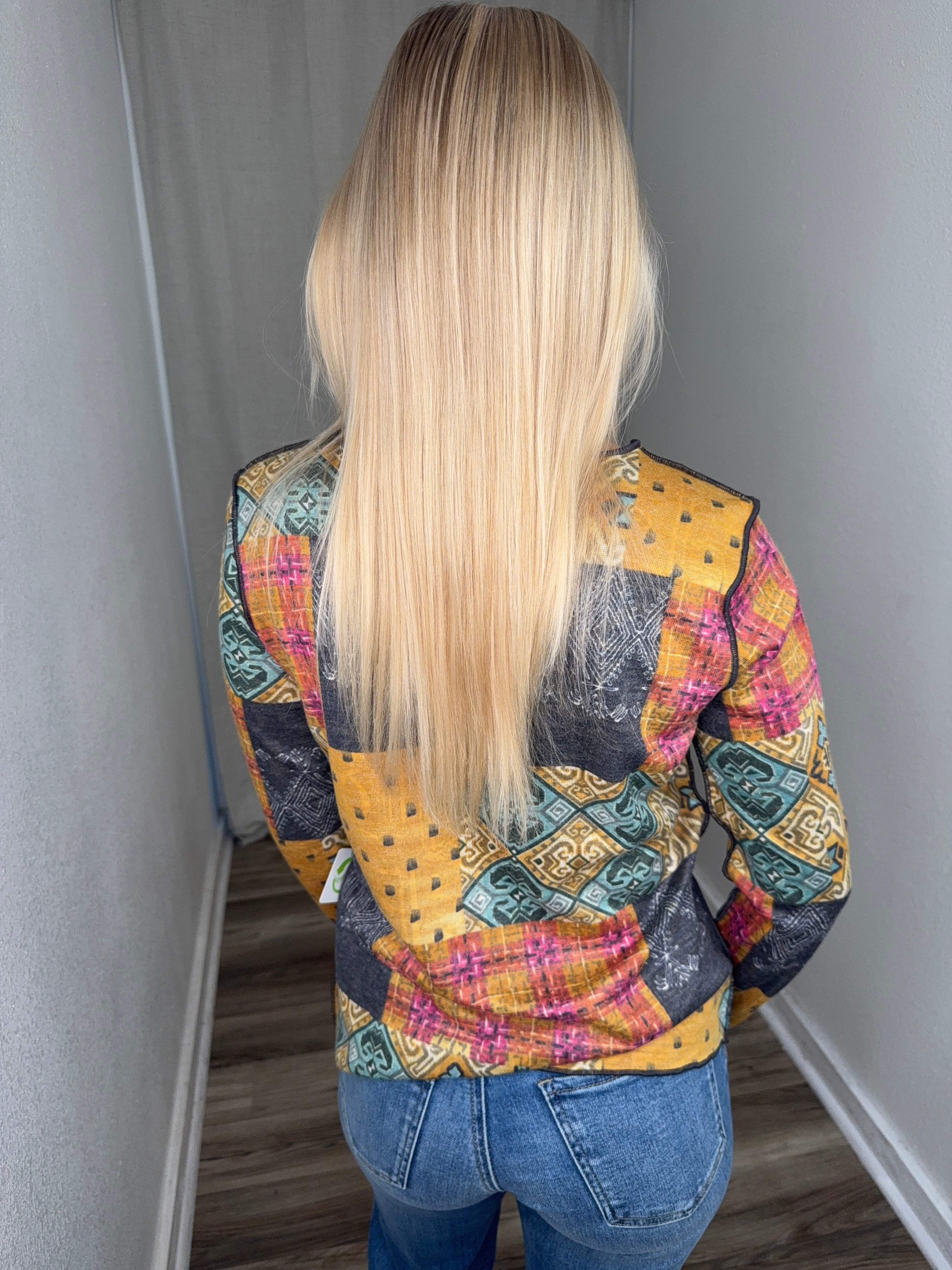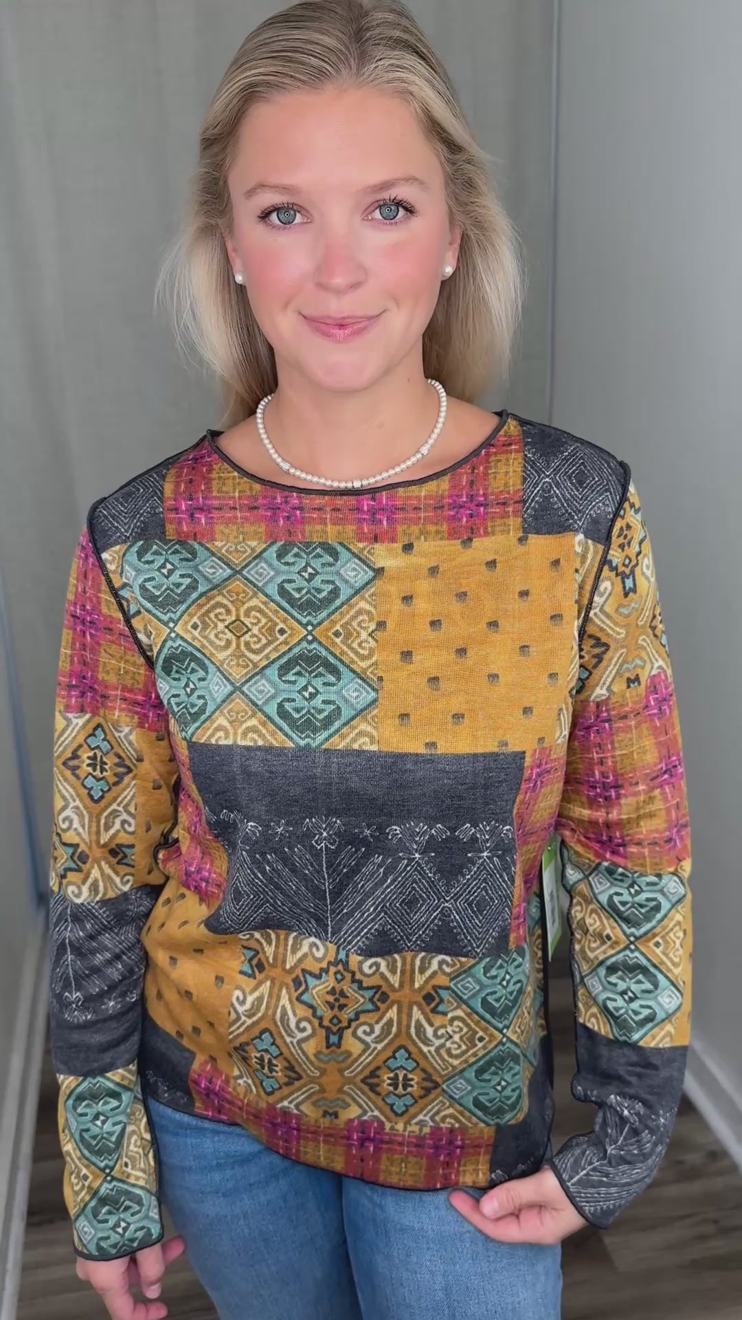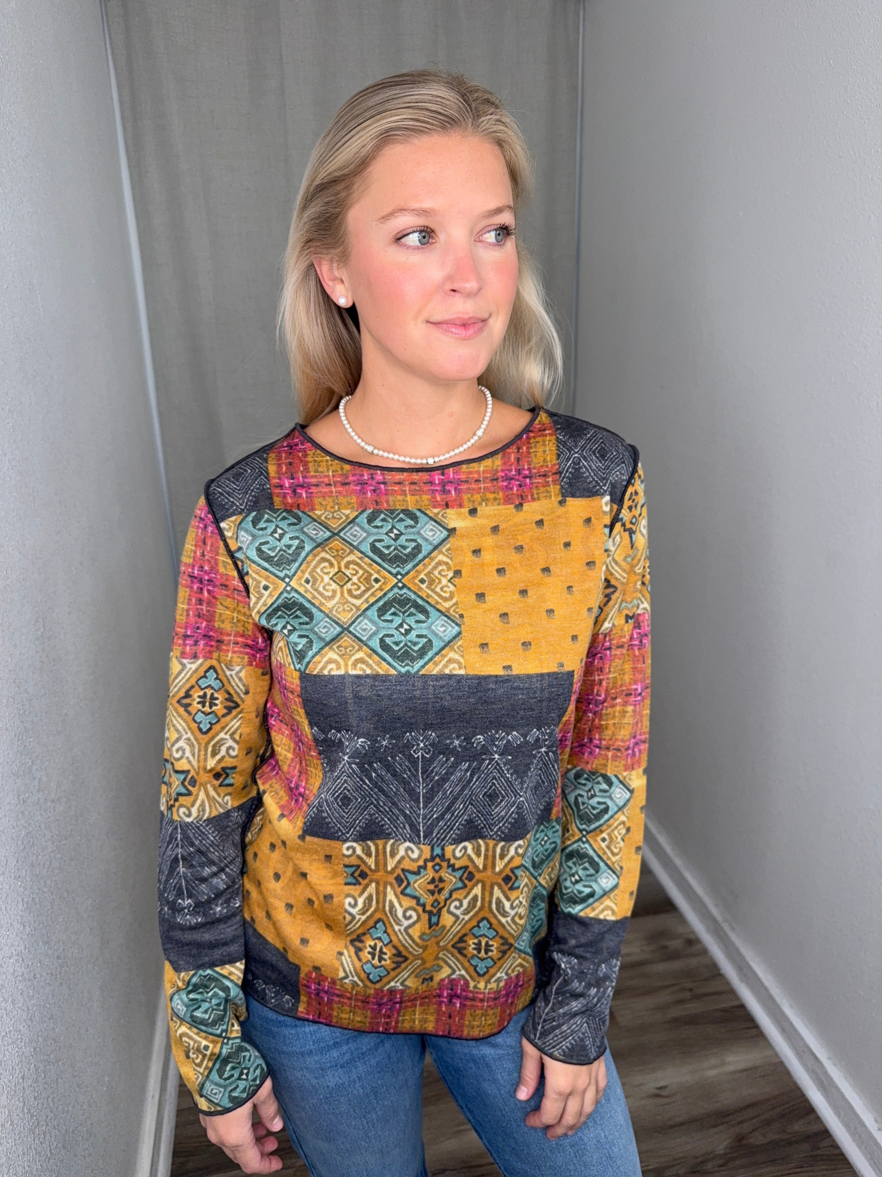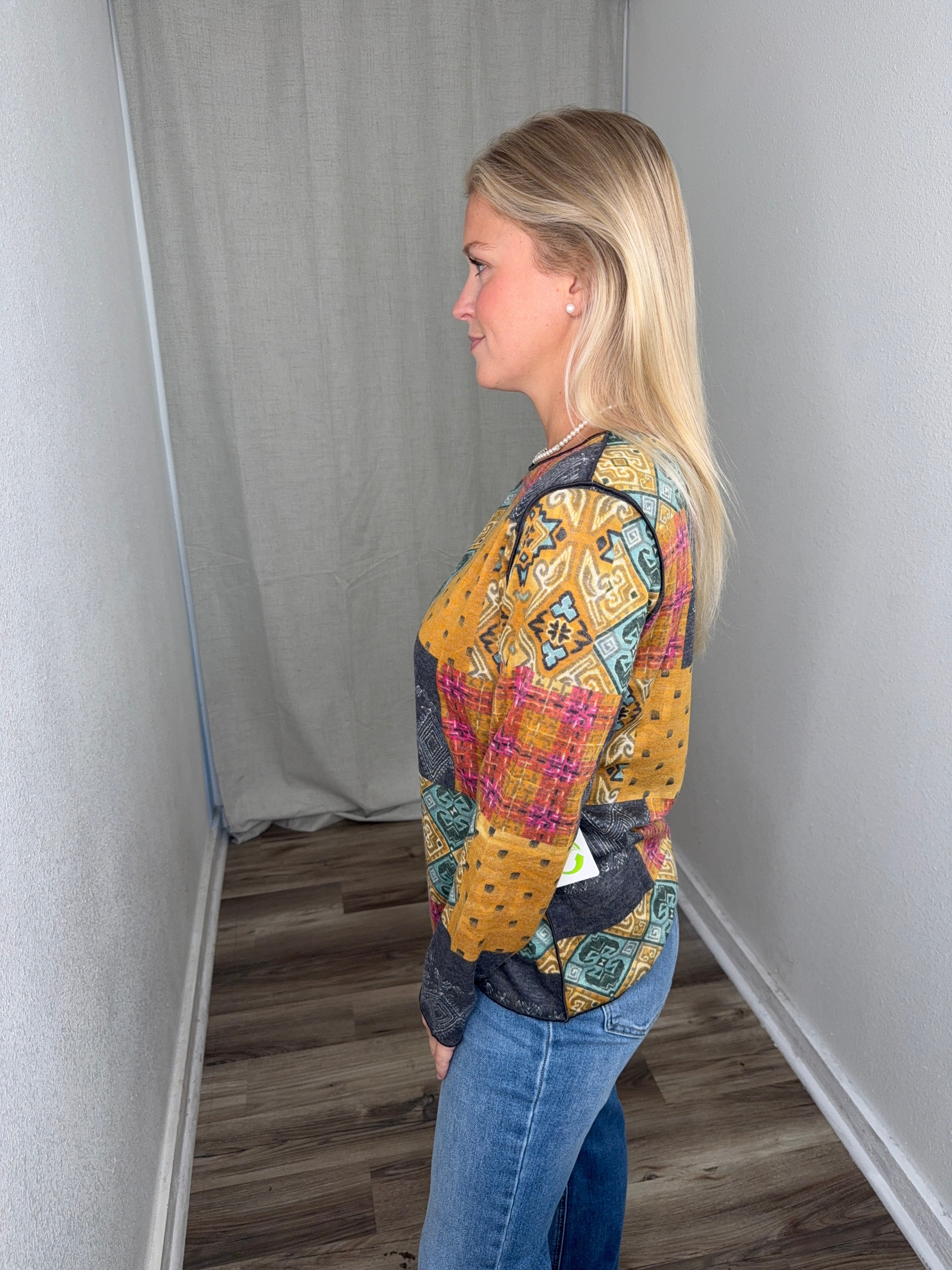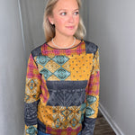 The Reversible Crew Neck offers two distinct looks in one versatile piece, making it a smart addition to any wardrobe. Its all-over patchwork-inspired print blends intricate motifs with rich color contrasts, creating a visually striking yet wearable design. Crafted from a soft, comfortable knit, it feels effortless against the skin and drapes beautifully for a flattering fit. The classic crew neckline and long sleeves make it an easy layering piece, while the reversible construction lets you switch up your style with ease. Perfect for casual days or adding an artistic touch to your everyday outfits, this top balances creativity with comfort.