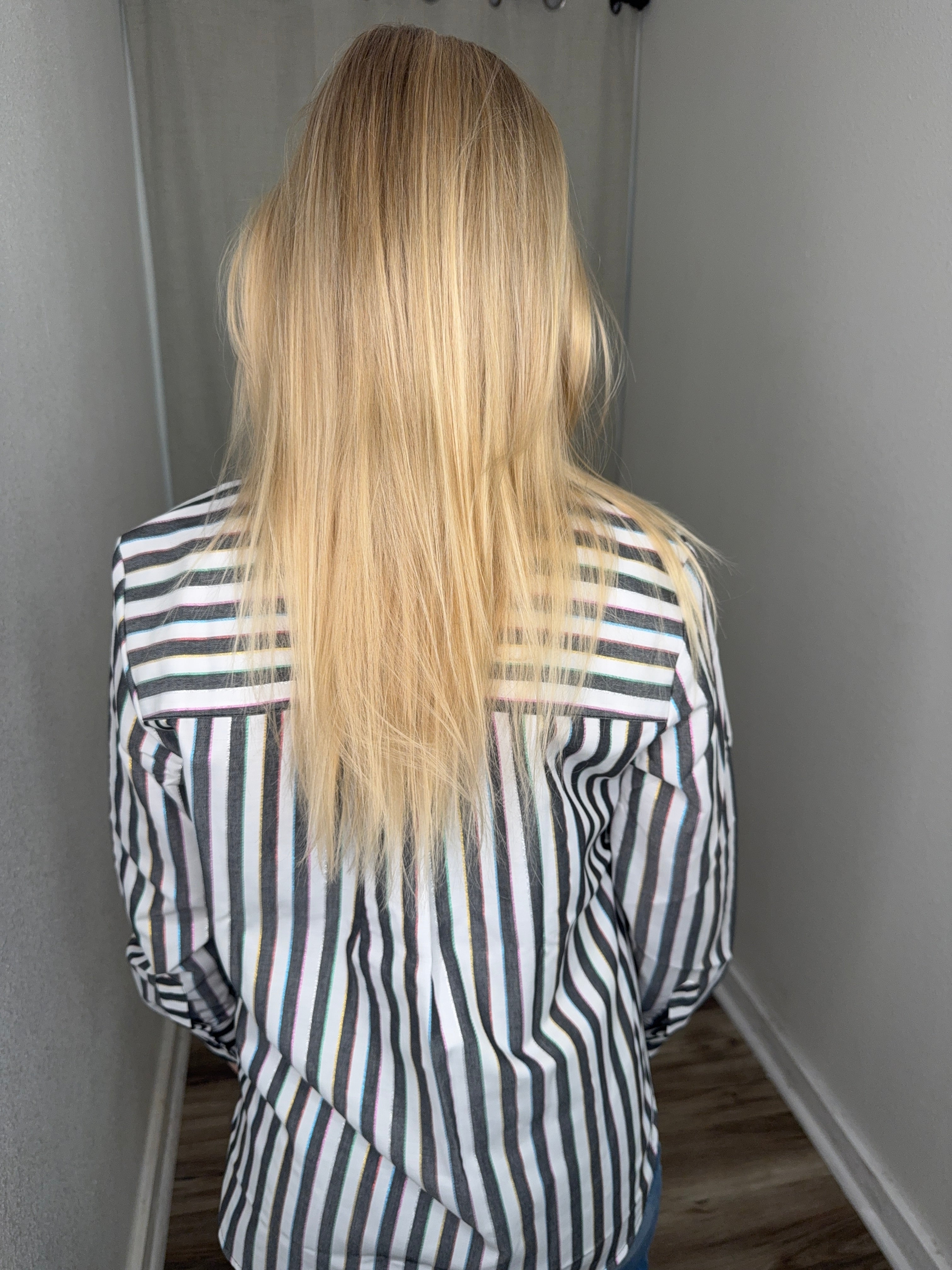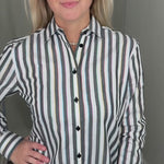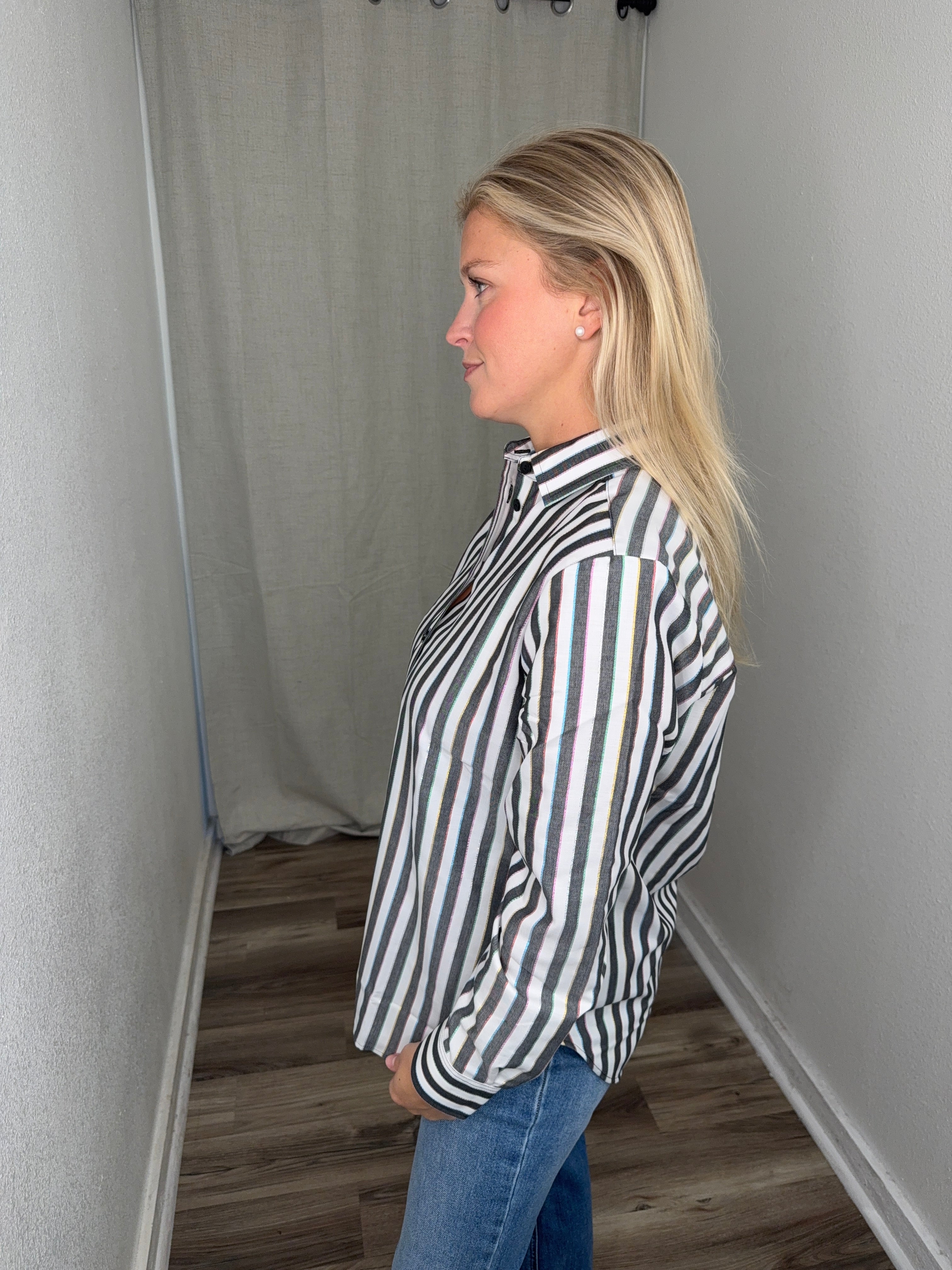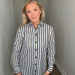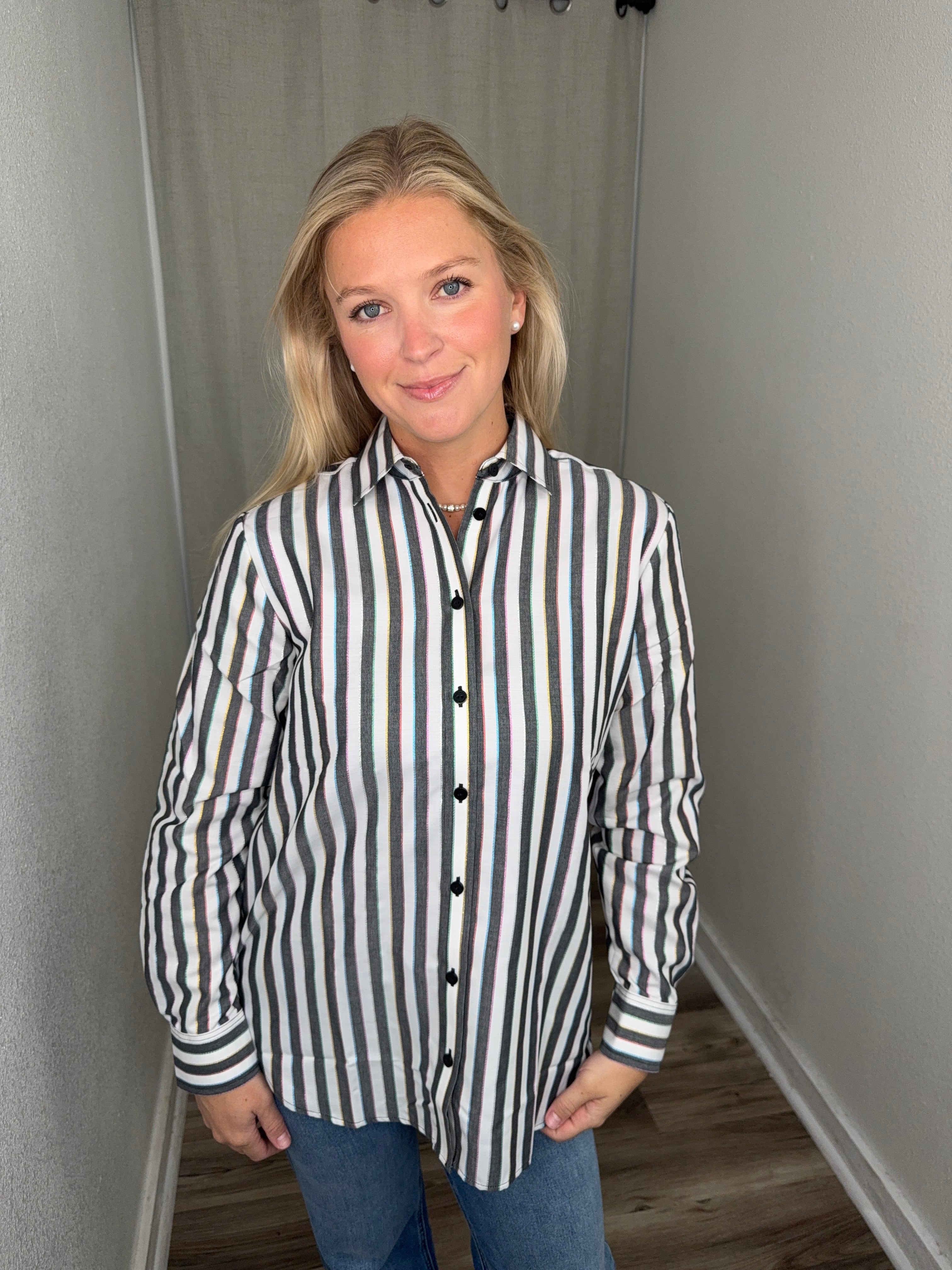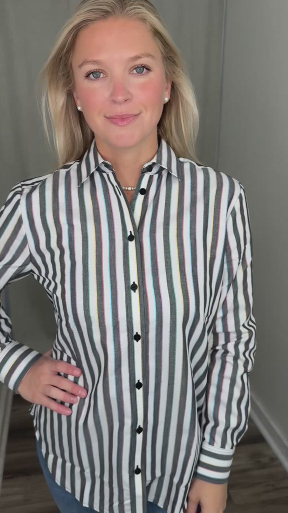 Classic vibes with a colorful twist. We reimagined our timeless Boyfriend shirt in black and white stripes edged with metallic color. The fit is everything you love about this popular silhouette: oversized and roomy, casual and comfortable. It’s laid-back enough to pair with denim but easy to dress up with black trousers and jewelry to match the shimmer and shine.