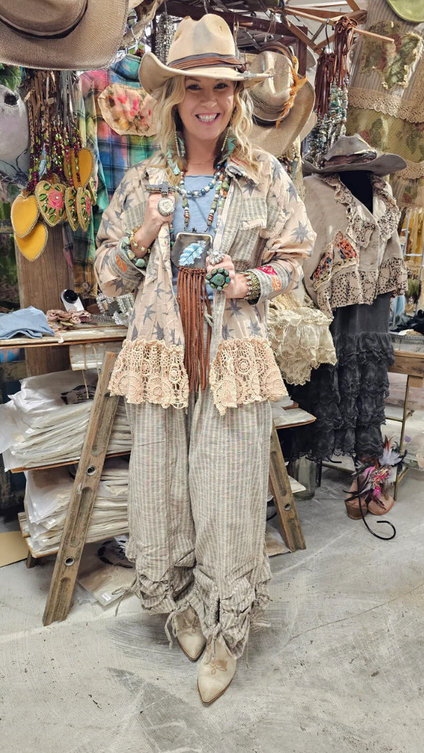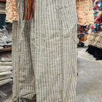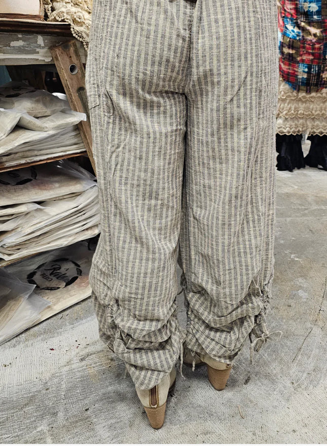 Amazing soft cotton pant with peek-a-boo ties at the bottom hem. These can be made shorter or longer with the adjustment casings at the bottom,