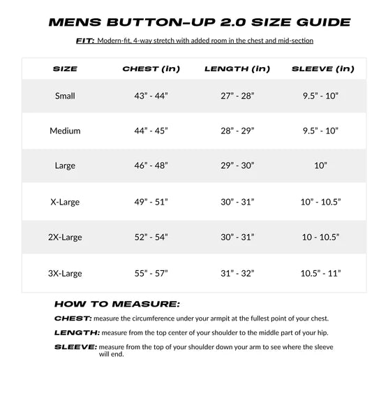 We leveled these shirts up with a softer, cotton-like fabric that moves with you. Designed with added stretch and a slightly roomier fit through the chest and waist, the Button-Up 2.0 is breathable, moisture-wicking, wrinkle-resistant, and packed with UPF 50+ protection. This is a shirt that doesn’t just look good — it feels good, too. It's built to keep you comfortable, frequently complimented, and ready for whatever’s next.