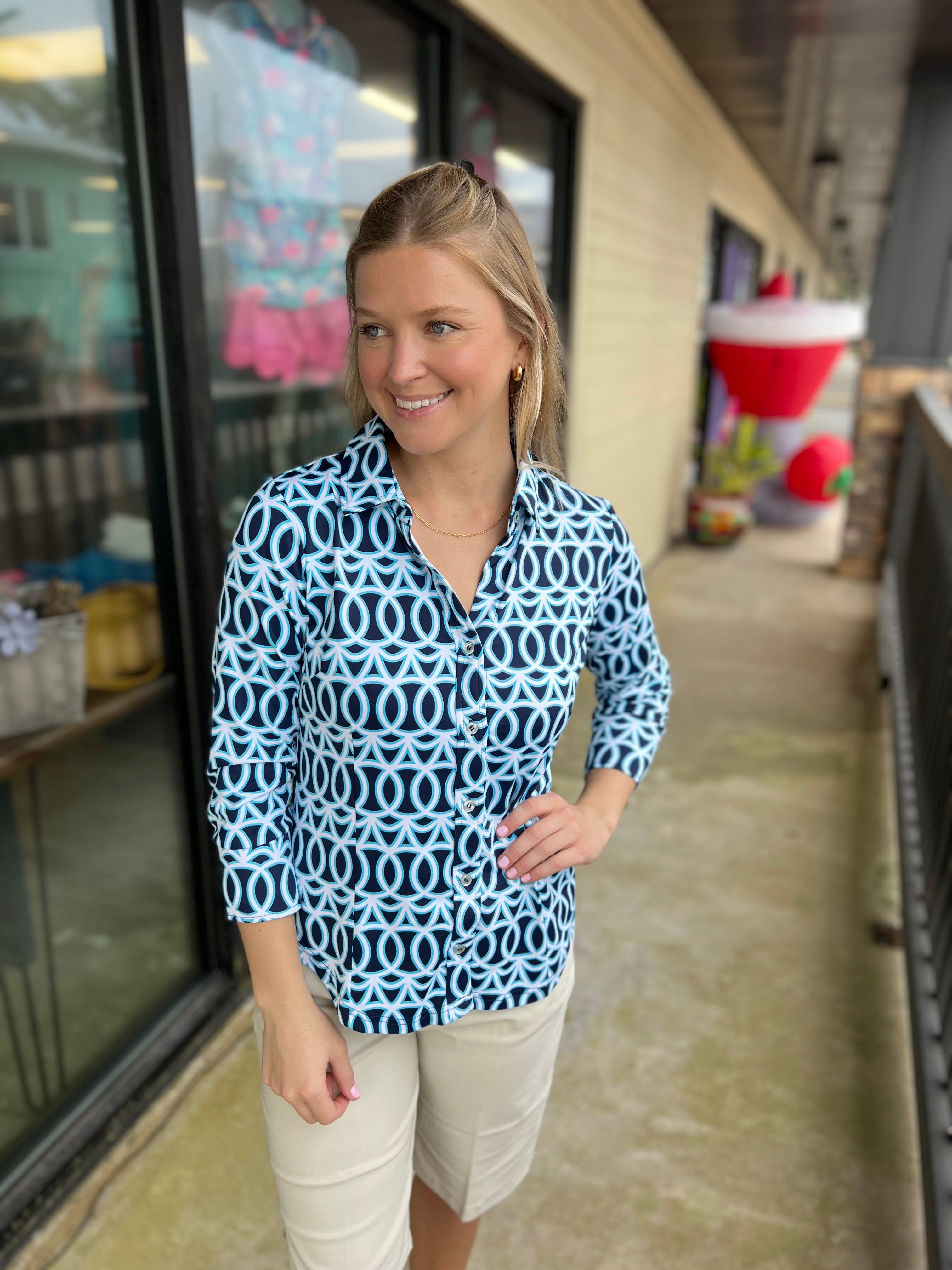 Blue and White Pattern Button Up Top