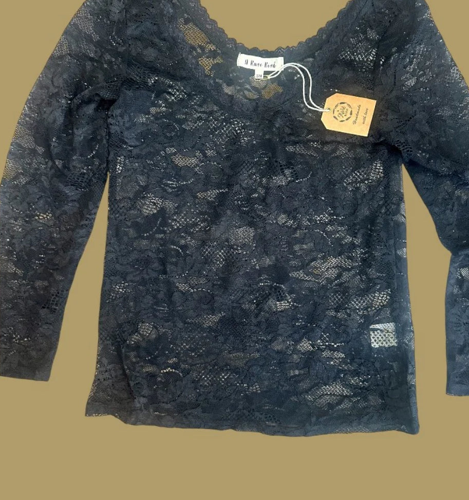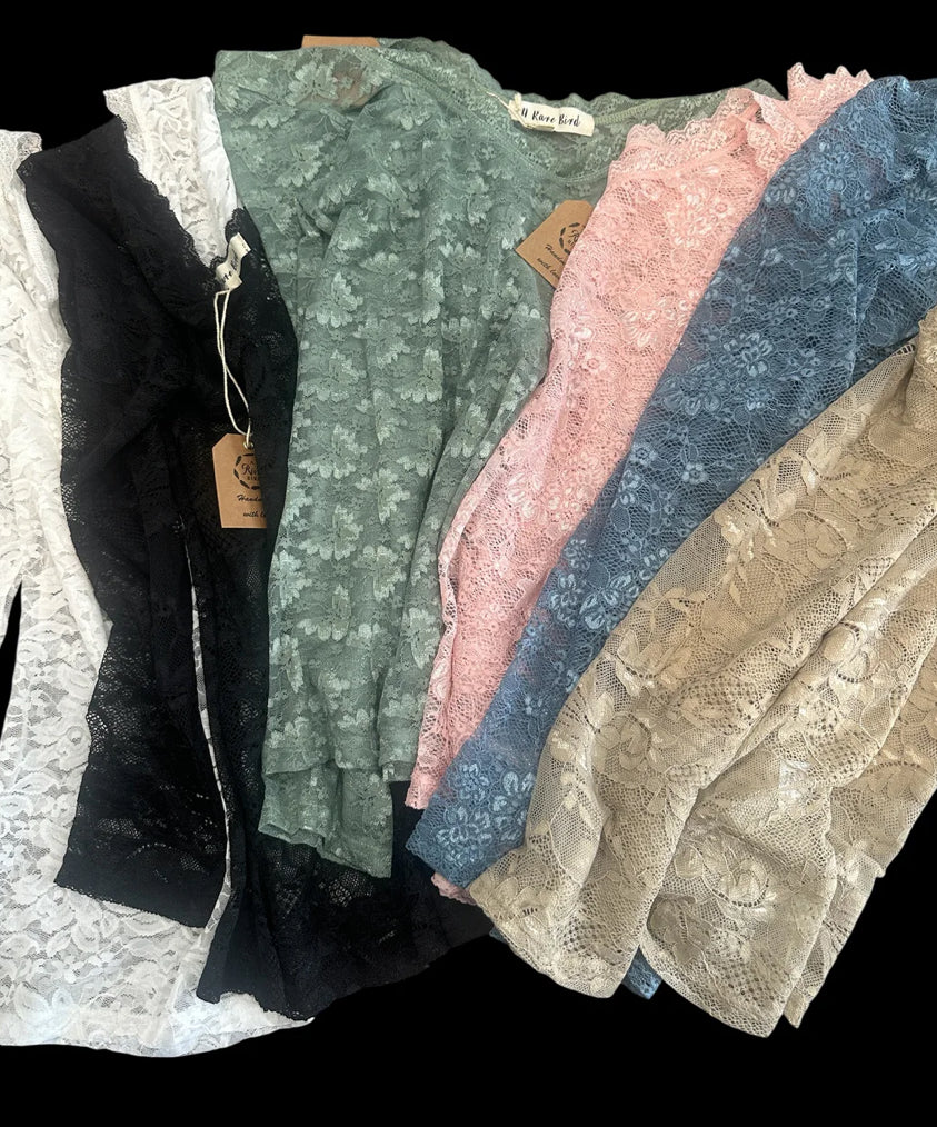Six beautiful colors of this scoop neck lace shirt gives a new look to any ensemble.  sm (2-10) lxl (12-2x) This shirt is a must have for any wardrobe. Very nice soft lace...only the BEST for A RARE BIRD!