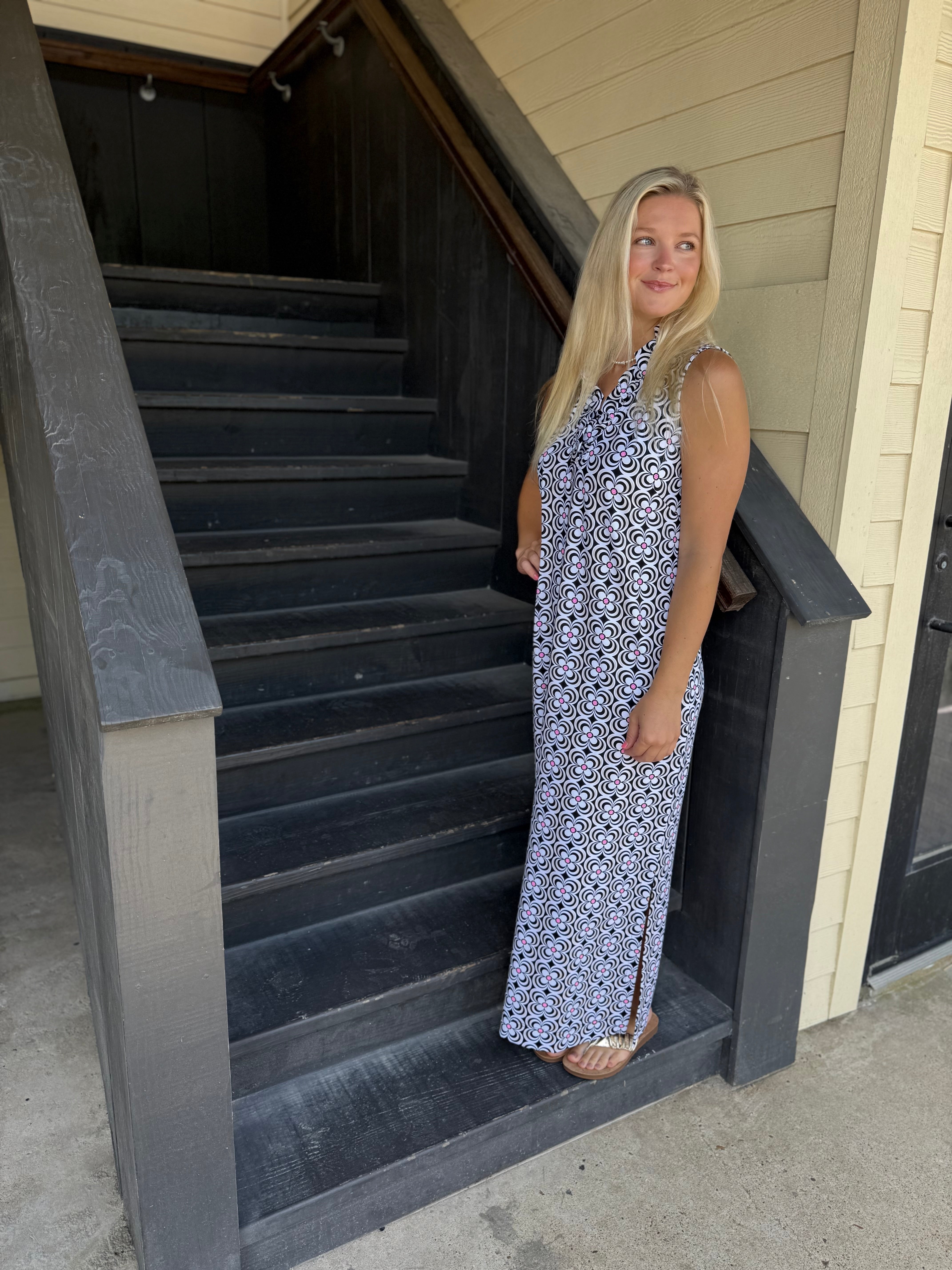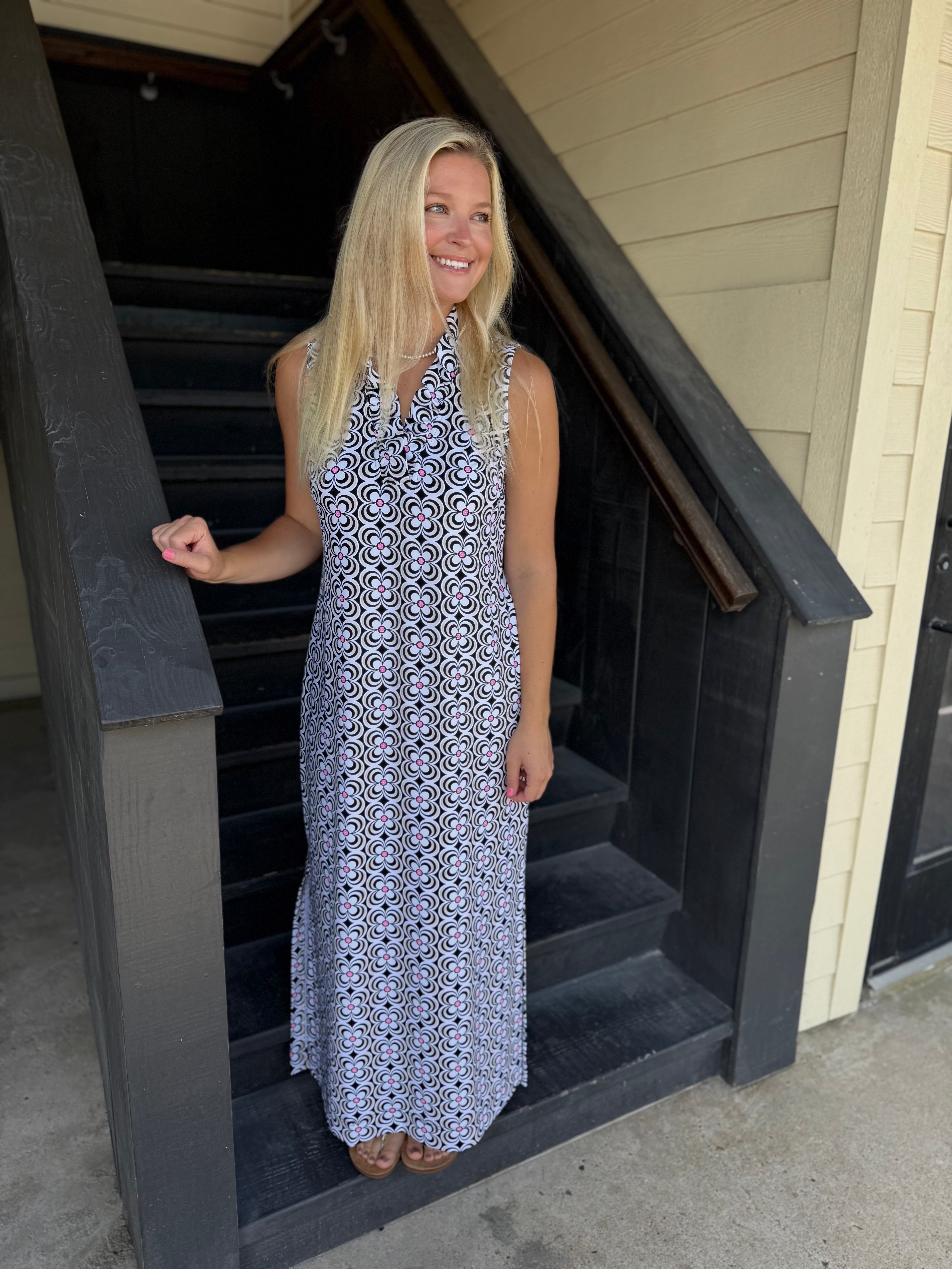 Black & Pink Floral Ruffle S.less Maxi