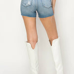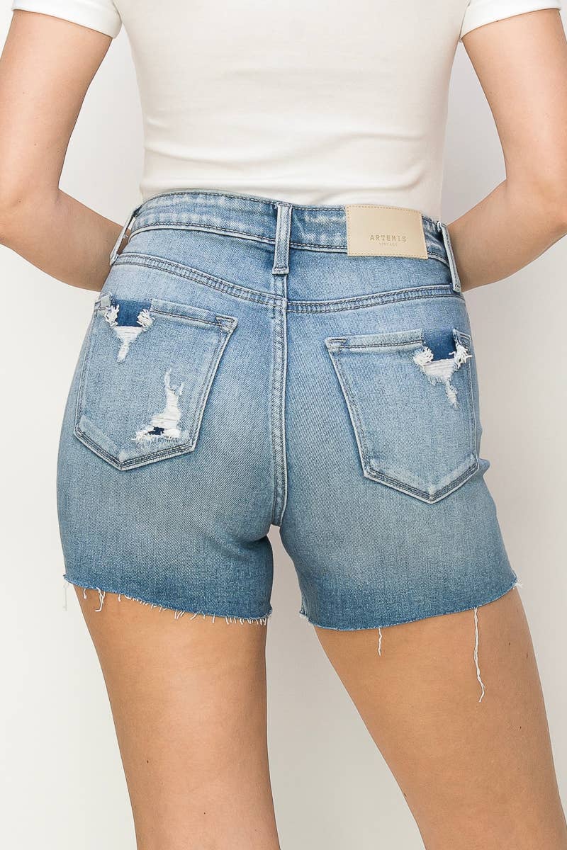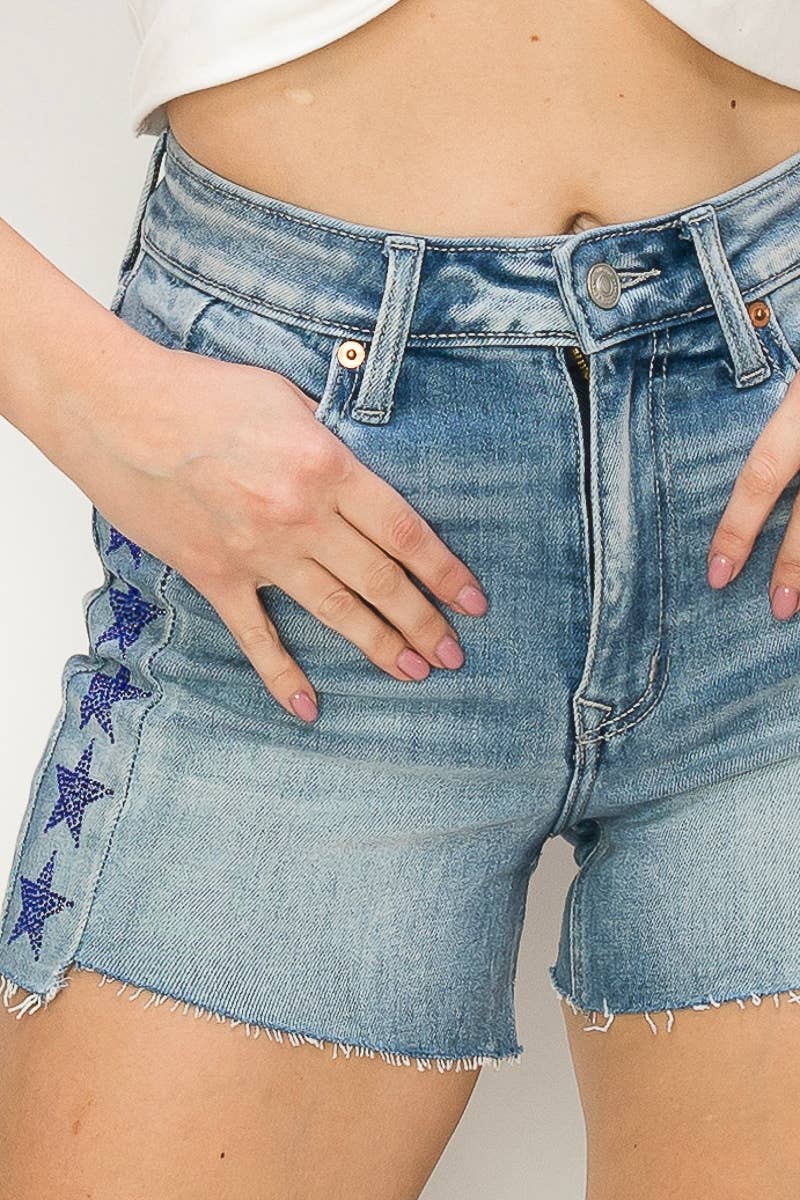 - HIGH QUALITY STAR RHINESTONE BOTH SIDES - STRETCH DENIM FABRIC - HIGH RISE - FRAYED HEM SPECS - FRONT RISE: 11" - INSEAM: 3 1/2" MADE FROM HIGH-QUALITY DENIM, THESE SHORTS ARE DESIGNED TO FIT AND FLATTER YOUR BODY WHILE PROVIDING MAXIMUM COMFORT. THE DISTRESSED DETAILING ON THE SHORTS GIVES THEM A TRENDY, EDGY VIBE, WHILE THE RHINESTONE ADDS A TOUCH OF GLAMOUR AND MAKES THEM STAND OUT FROM OTHER DENIM SHORTS. THE FRINGE DETAIL ALSO PROVIDES A PLAYFUL MOVEMENT THAT ADDS A DYNAMIC ELEMENT TO THE SHORTS. THESE SHORTS ARE VERSATILE AND CAN BE DRESSED UP OR DOWN DEPENDING ON THE OCCASION. PAIR THEM WITH A SIMPLE COTTON TOP AND SNEAKERS FOR A CASUAL DAYTIME LOOK, OR PAIR THEM WITH A BLOUSE AND HEELS FOR A NIGHT OUT ON THE TOWN. THE HIGH-QUALITY DENIM MATERIAL ENSURES THAT THESE SHORTS WILL LAST FOR SEASONS TO COME. THE MIX OF CLASSIC DENIM FABRIC AND PLAYFUL, RHINESTONES DETAILING MAKE THESE SHORTS A MUST-HAVE ADDITION TO ANY FASHION-FORWARD WARDROBE.