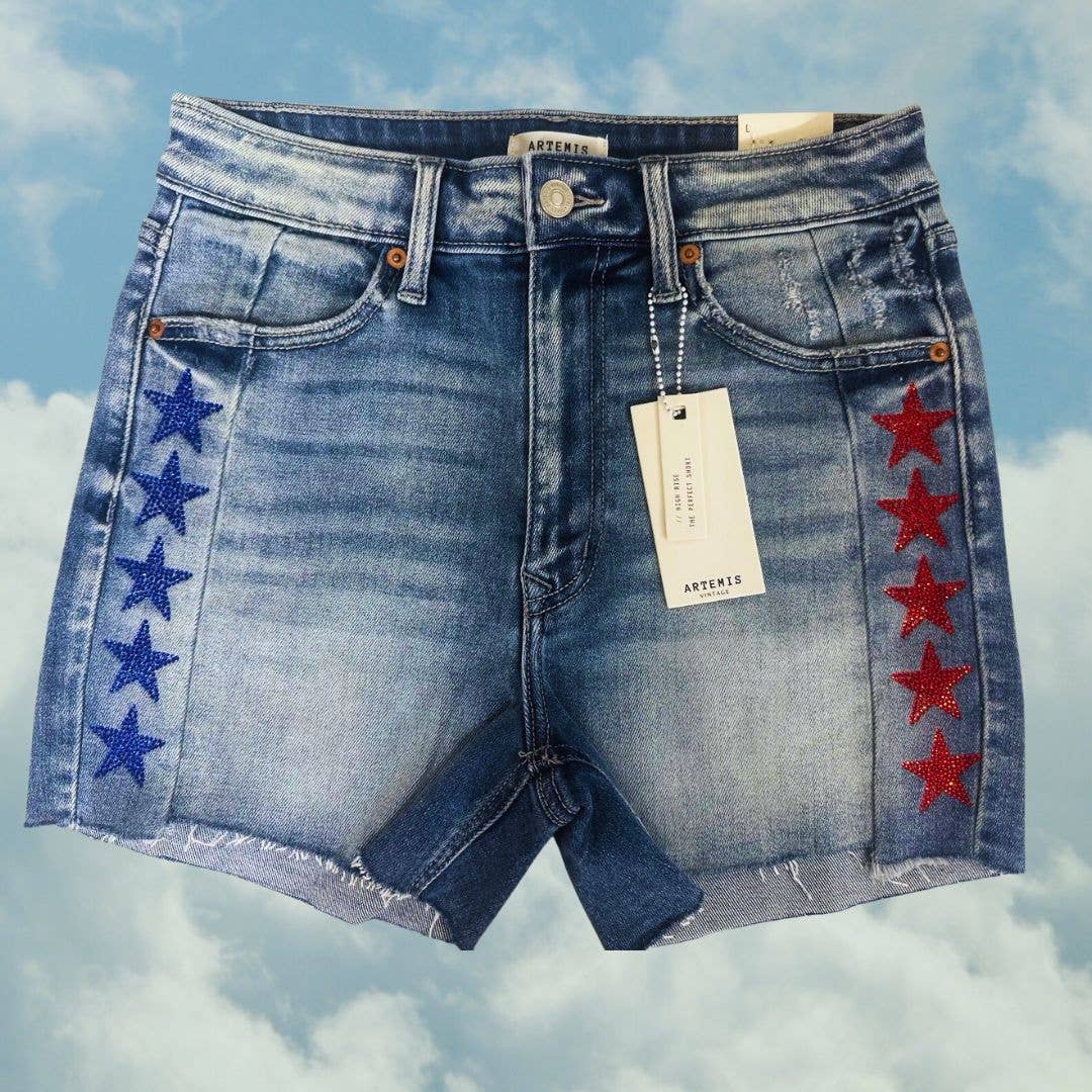 BLUE & RED STARS RHINESTONE HIGH RISE SHORTS: XL (29)