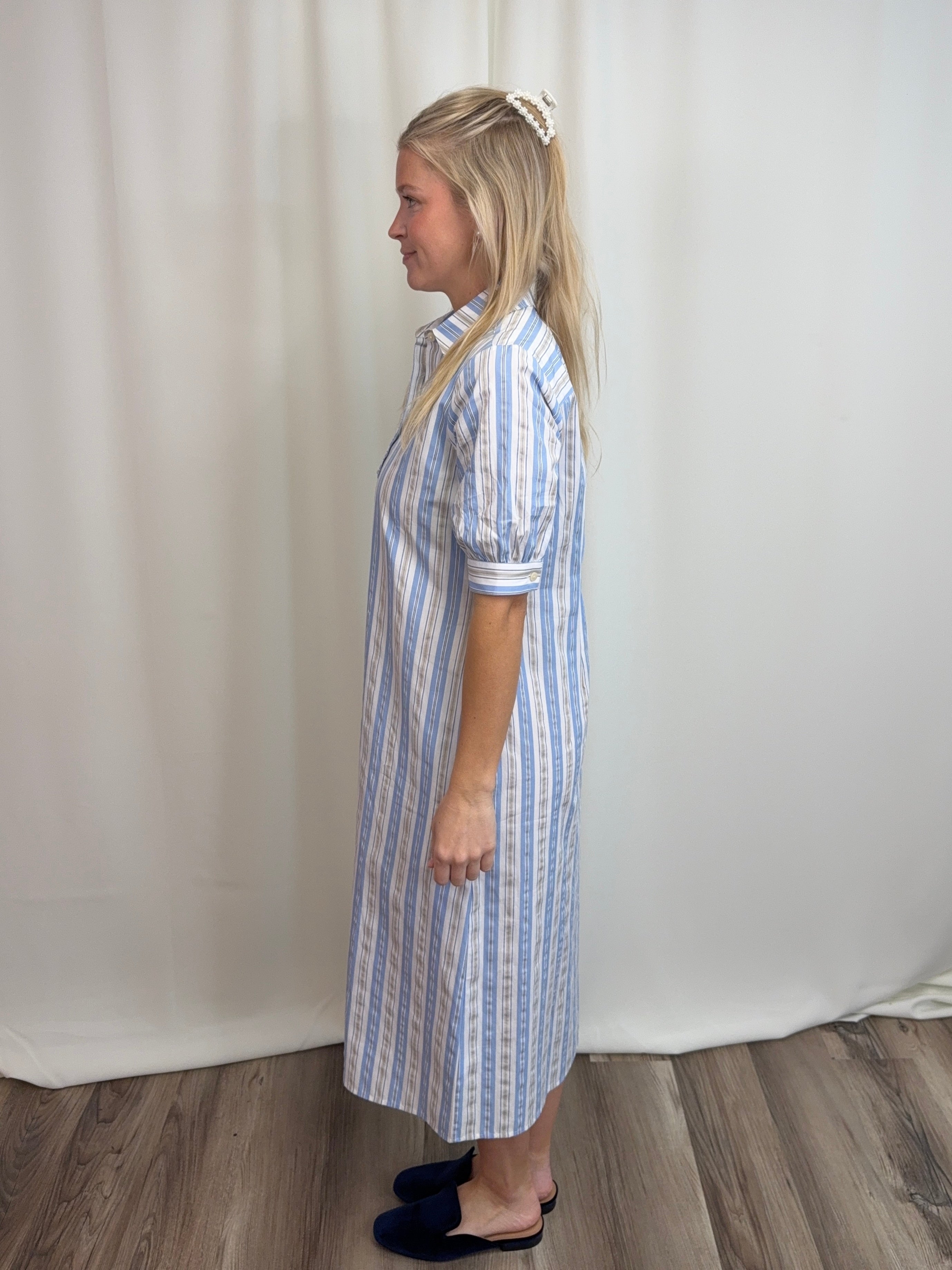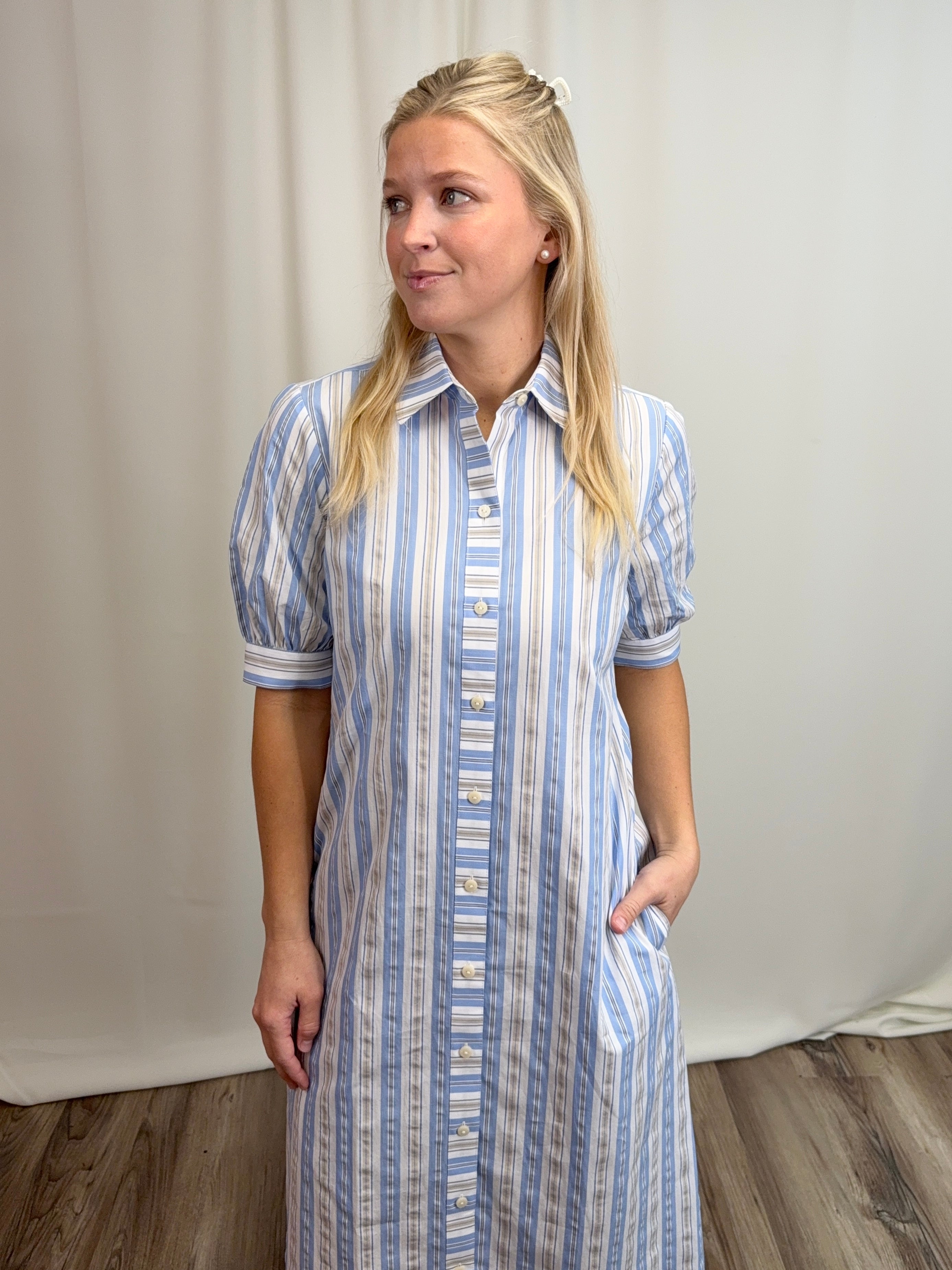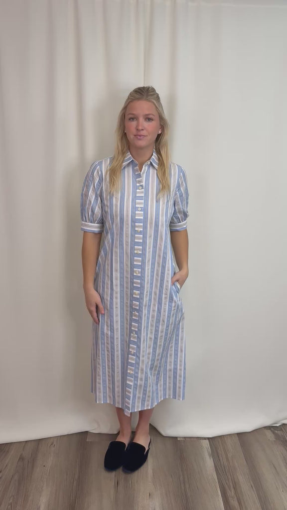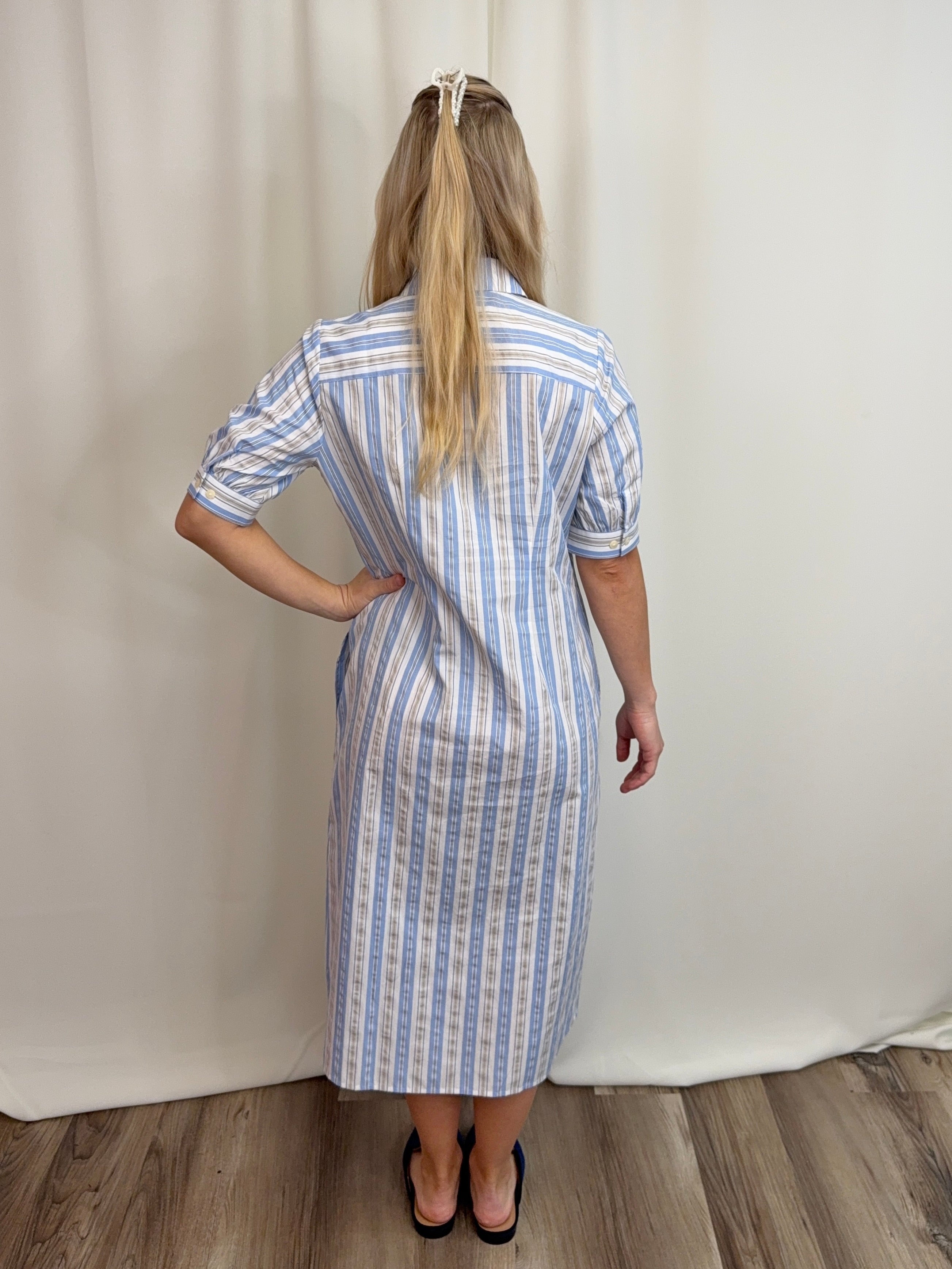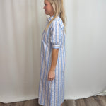 Blue Seersucker Stripe Dress in 100% cotton—lightweight and breathable for warm weather. Features a classic shirt dress silhouette with button-front placket, elbow-length sleeves, and a fluid midi skirt. The blue, white, and khaki stripes offer timeless coastal appeal. Includes an optional self-tie sash to cinch the waist and functional on-seam pockets. Easy regular fit works dressed up or down. Limited availability.