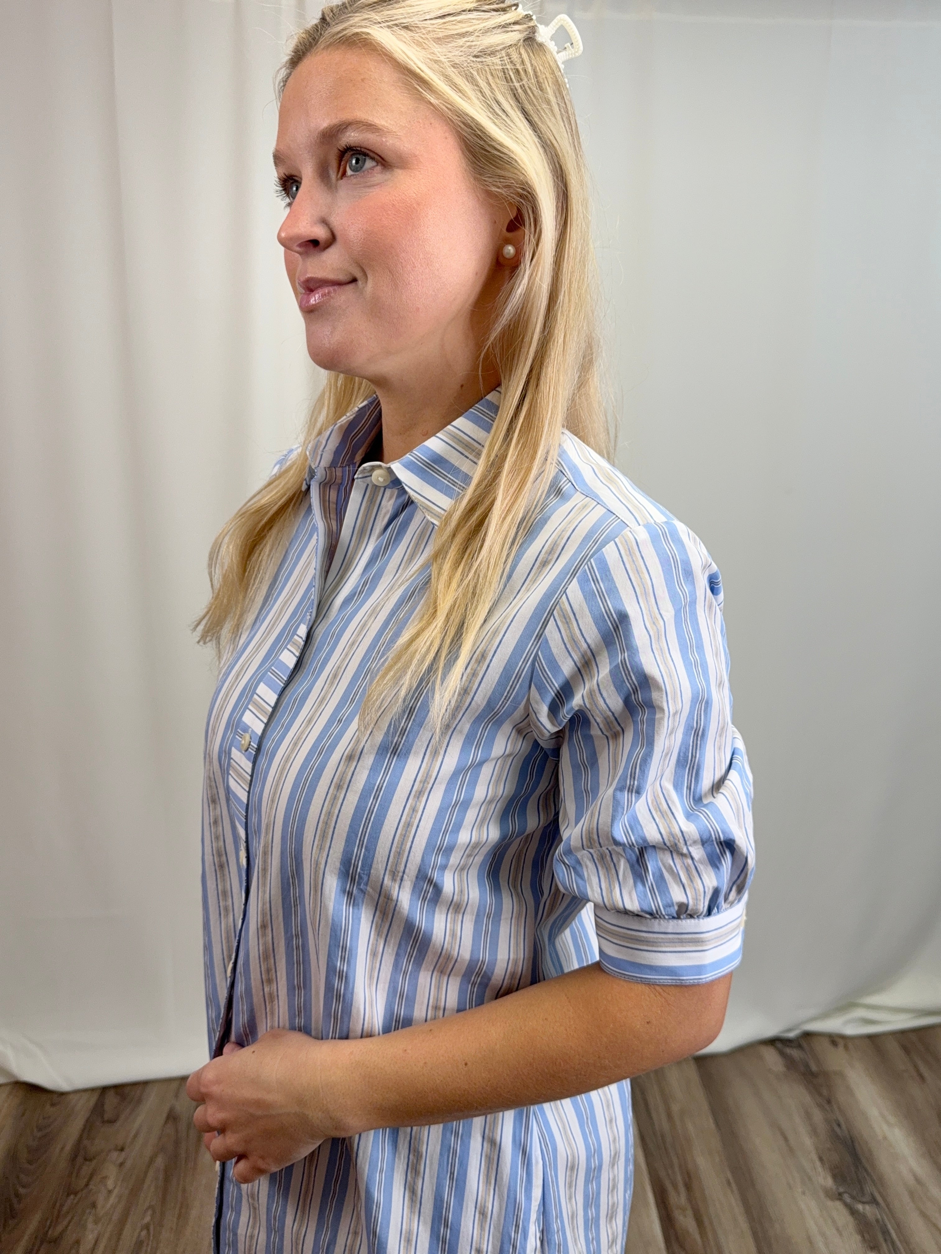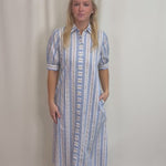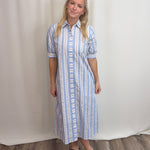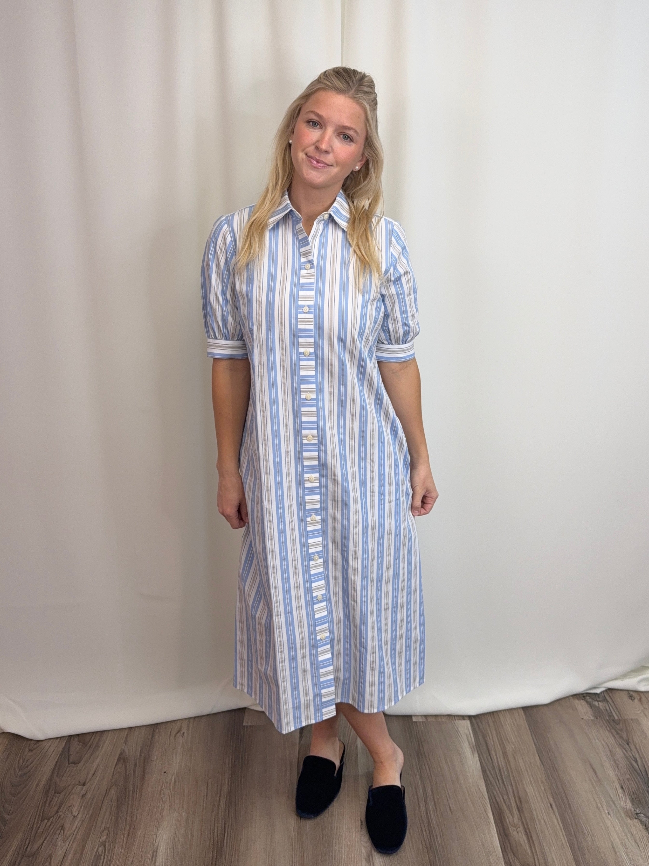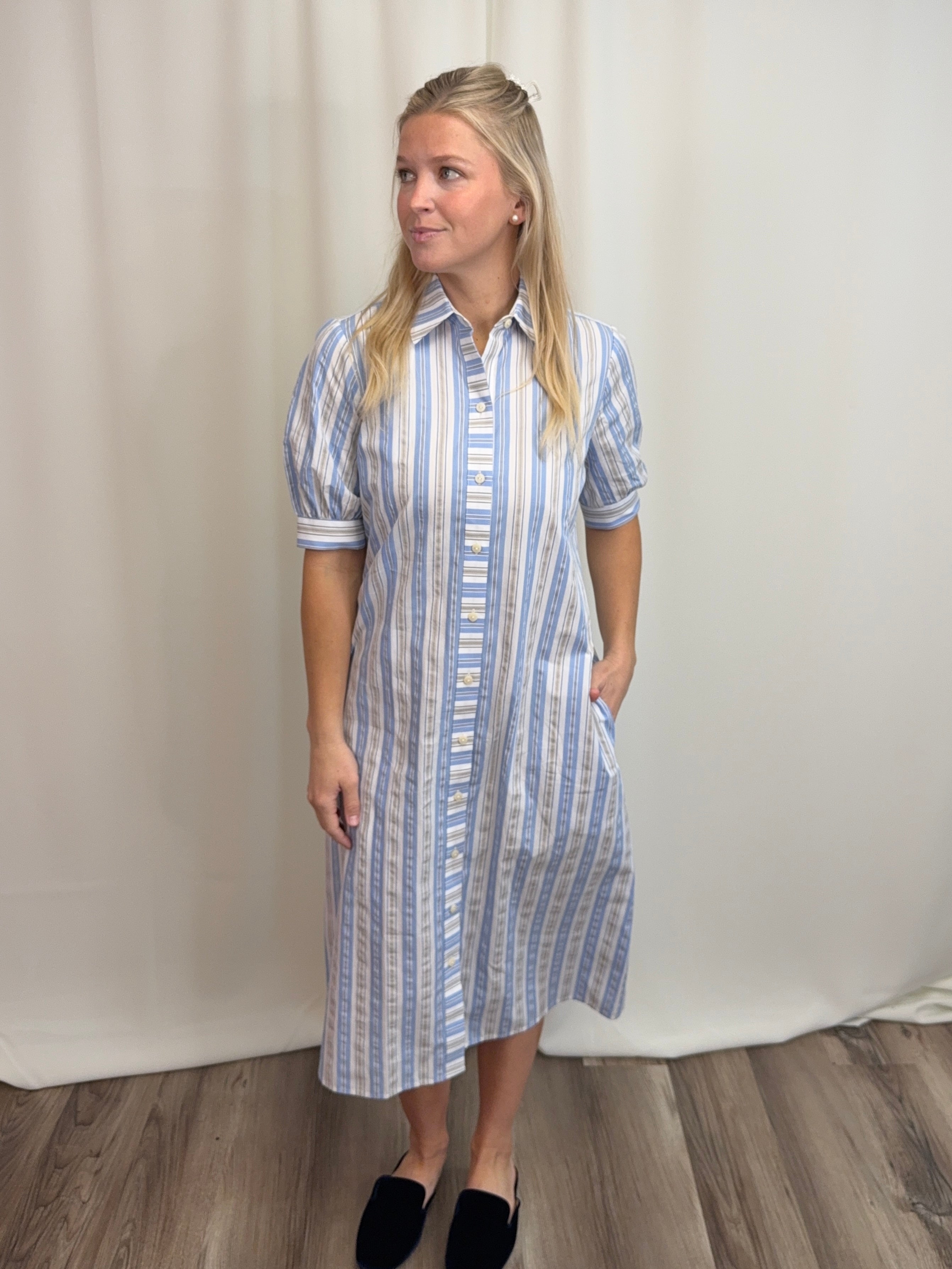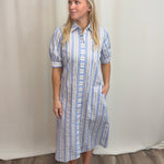 Blue Seersucker Stripe Dress in 100% cotton—lightweight and breathable for warm weather. Features a classic shirt dress silhouette with button-front placket, elbow-length sleeves, and a fluid midi skirt. The blue, white, and khaki stripes offer timeless coastal appeal. Includes an optional self-tie sash to cinch the waist and functional on-seam pockets. Easy regular fit works dressed up or down. Limited availability.