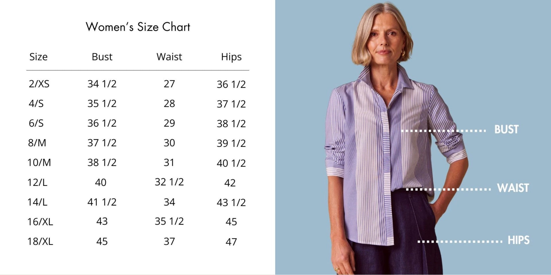 "Have sizes from petite to plus. Clothing are a nice variety. Lots of very stylish UV protection clothing for swimming boating etc. Sales woman was very helpful found my sizes and style I love. Clothing is expensive from $55 to 100 for tops. Jeans at least $90 Definitely not Kohl's. Higher end Clothing. If you have a healthier budget Definitely the place to go!"