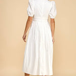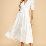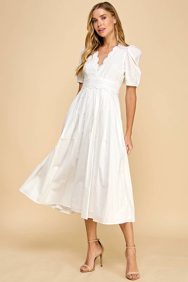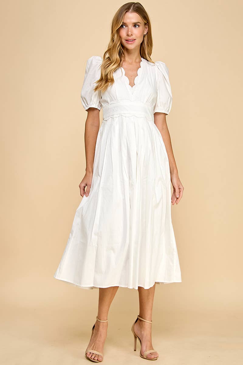 Solid midi dress featuring a V-neckline with scalloped detail, short puff sleeves, a belted waist, and a concealed back zipper. Model Size + Fit: Model height: 5'9" Dress size: Small Bust: 33 Waist: 25 Hips: 34