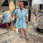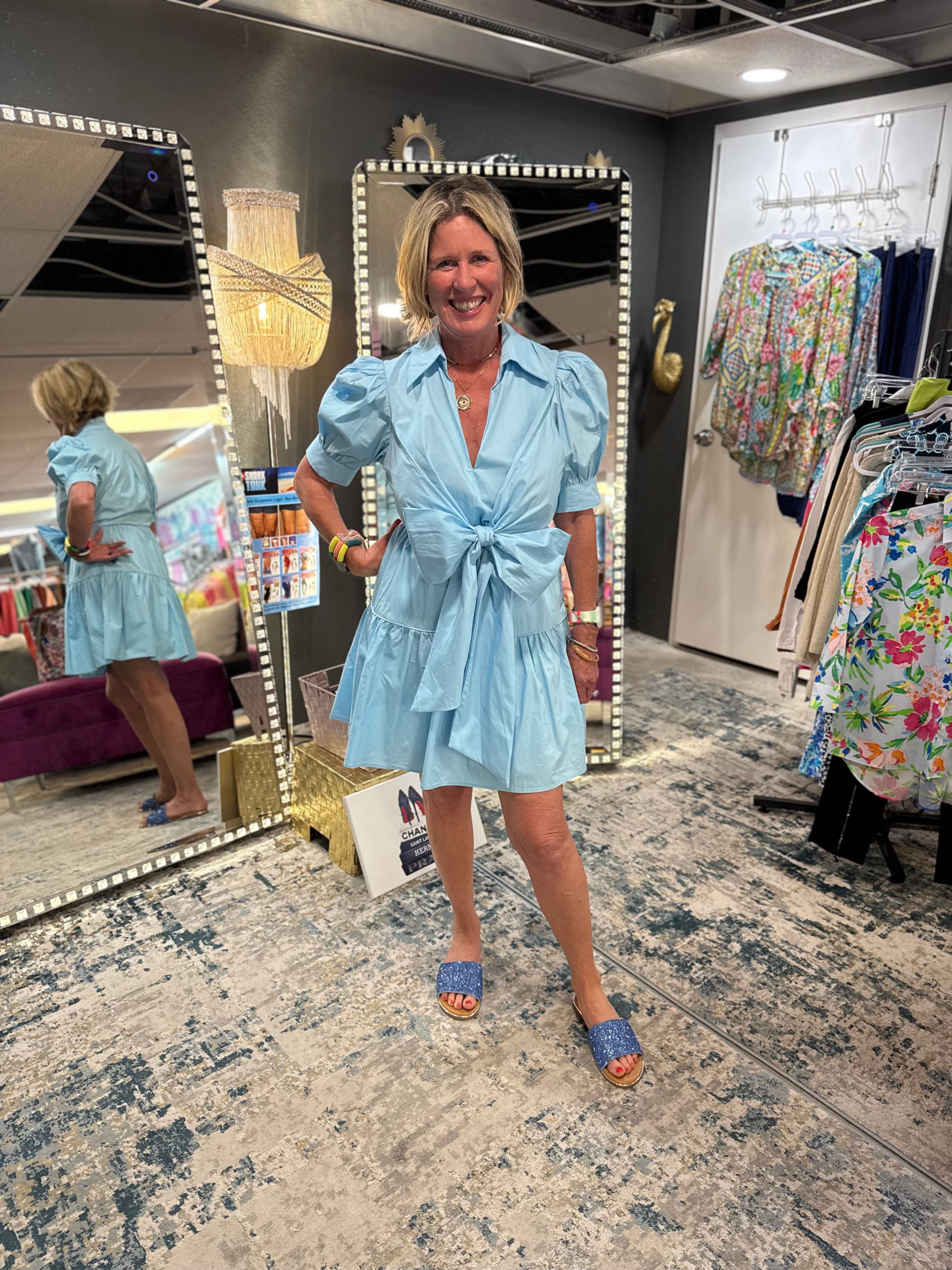 Poplin collared V-neck dress featuring short puffedsleeves, a dramatic waist bow, and a tiered skirt fo a sophisticated and feminine look. Model Size + Fit:odel height: 5'9" Dress size: Small Bust: 33 Waist: 5 Hips: 34