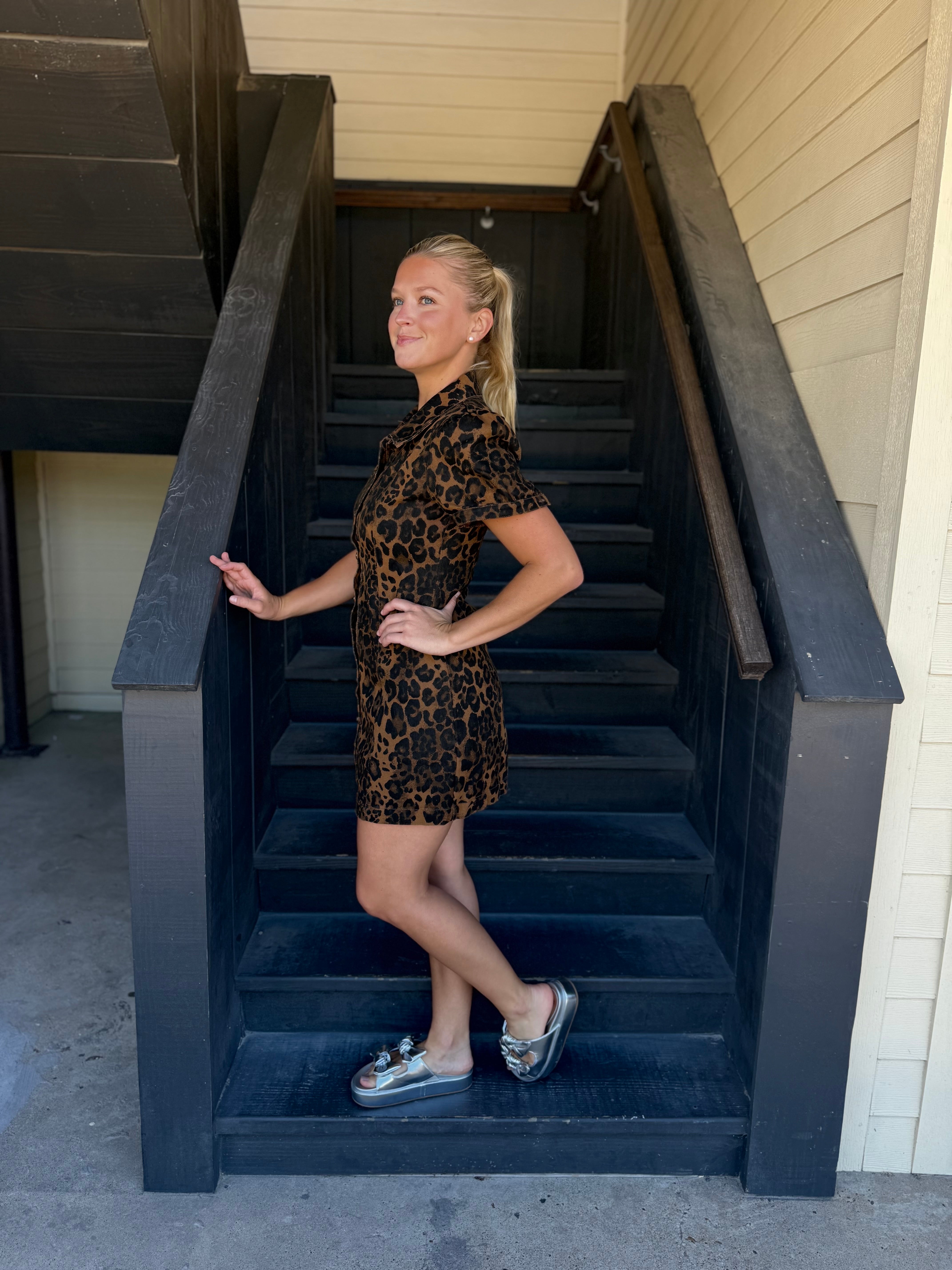 Chic leopard-printed denim shirt dress with playful short puff sleeves for a bold, stylish look. Model Size + Fit: Model height: 5'8" Dress size: Small Bust: 32 Waist: 24.5 Hips: 35.5