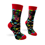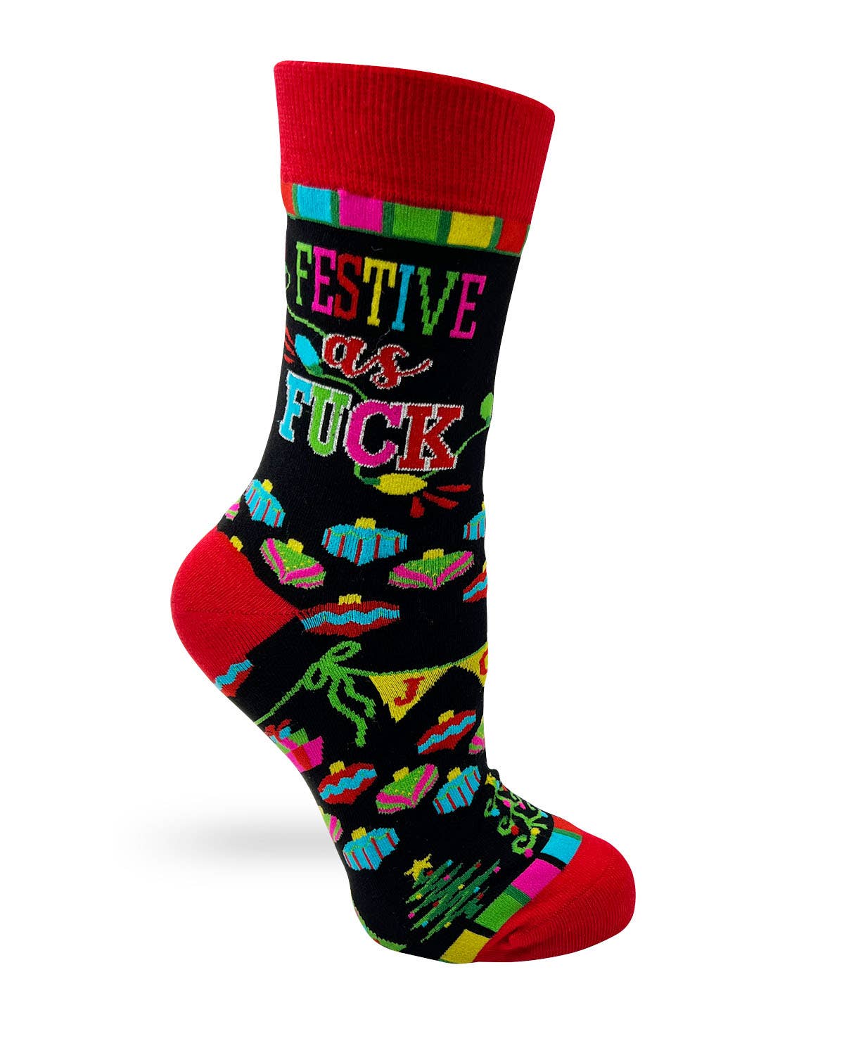 Women's Novelty Socks Festive as Fuck. Featuring cute Christmas ornaments and string lights. Stylish and comfortable! Fits ladies' shoe size 5 to 10. 80% Cotton, 15% Nylon, 5% Spandex. Easy Care - Machine Wash. Item # SK0167 The Perfect Gift! Get a pair for all your friends and don't forget some for yourself!