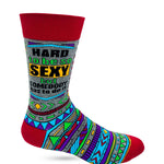 Funny men's novelty crew socks "Hard to Be Sexy But Somebody Has to Do It." Stylish and comfortable! Fits men's shoe size 7 to 12. 80% Cotton, 15% Nylon, 5% Spandex. Easy Care - Machine Wash. Item # SK1071