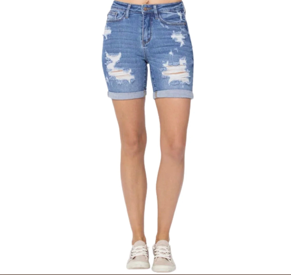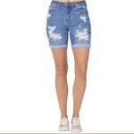 Judy Blue Hi Waisted Mid Length Distressed Shorts