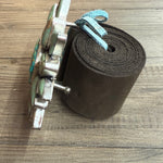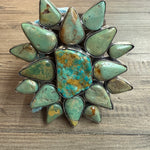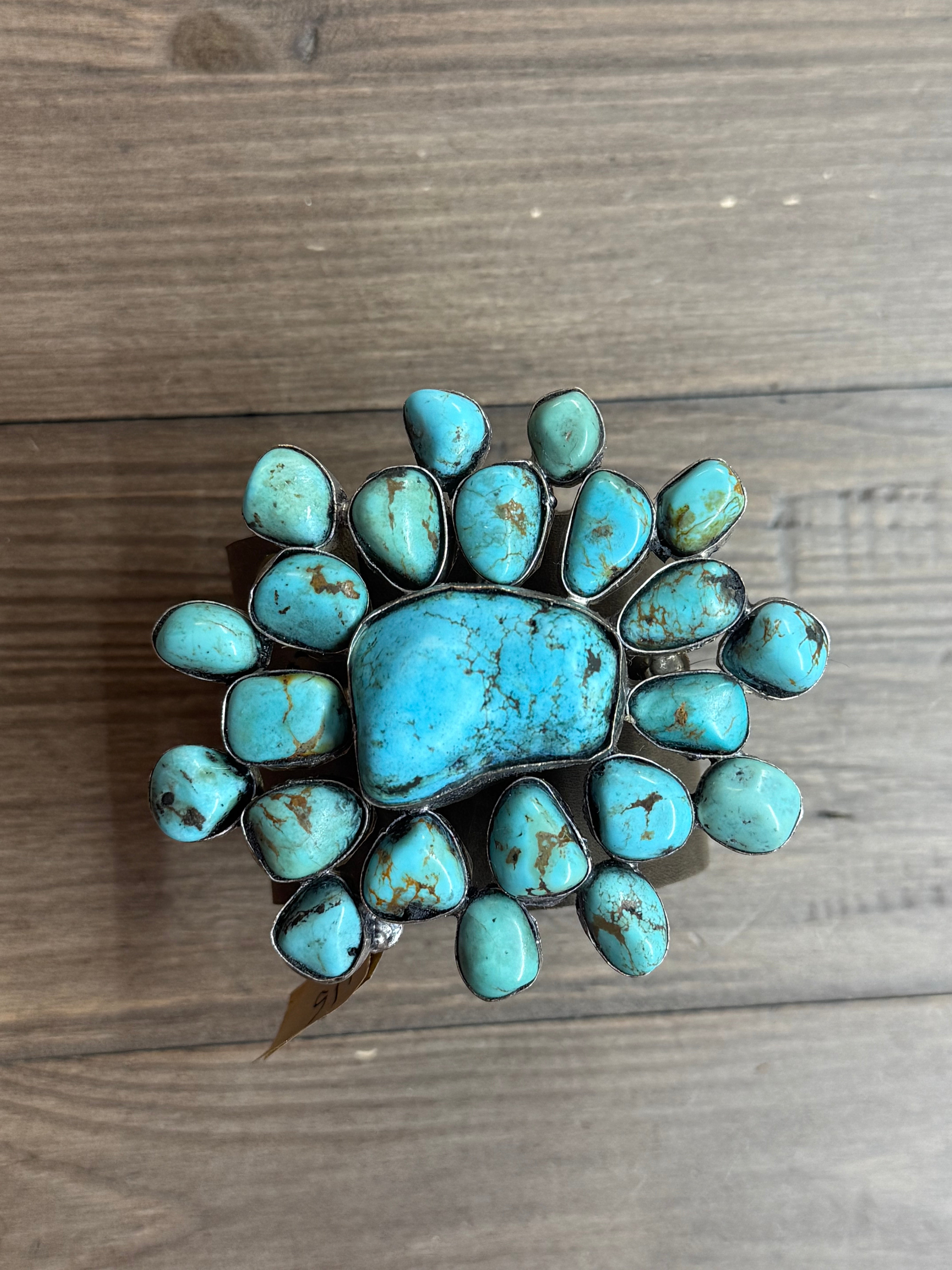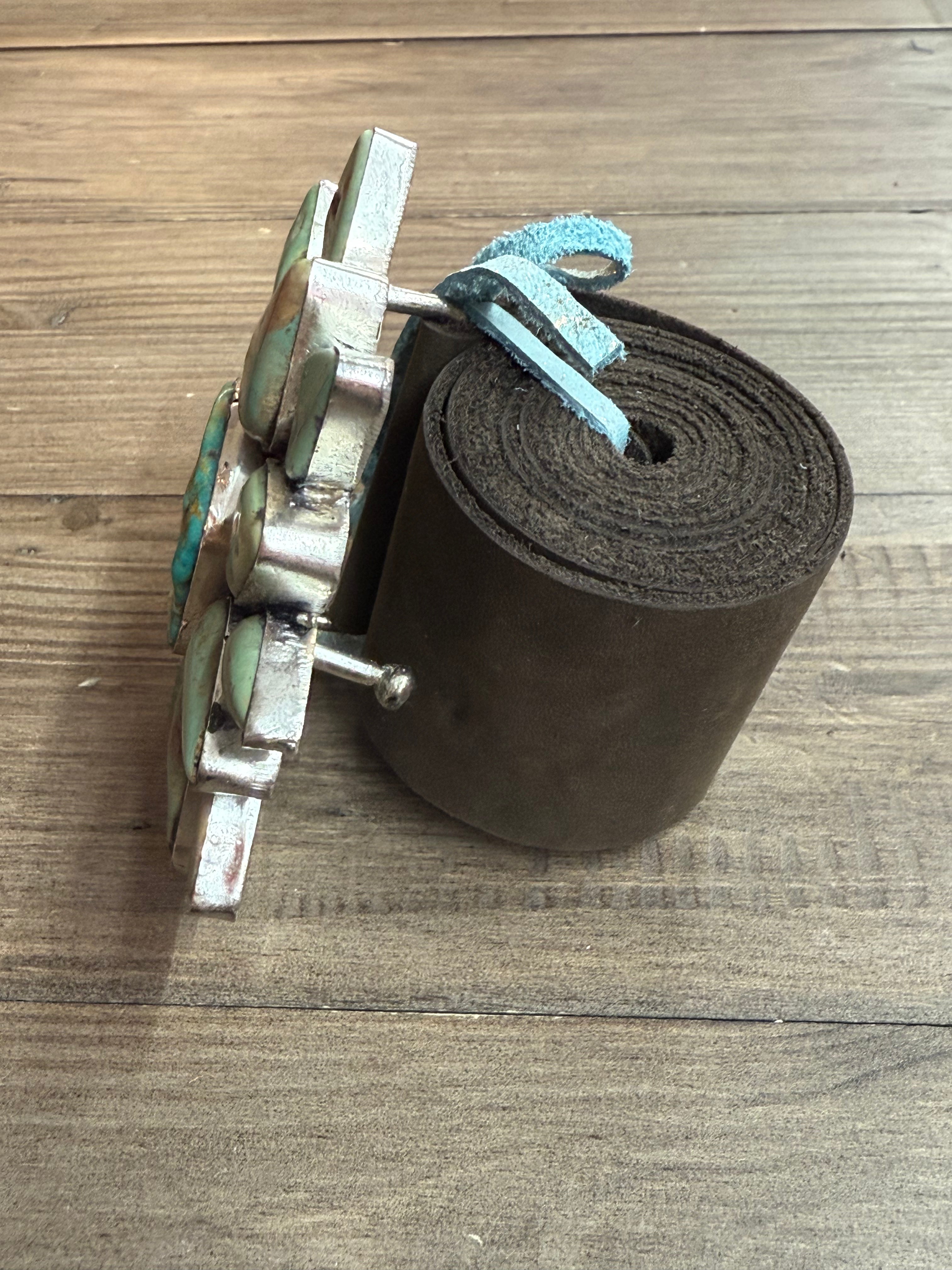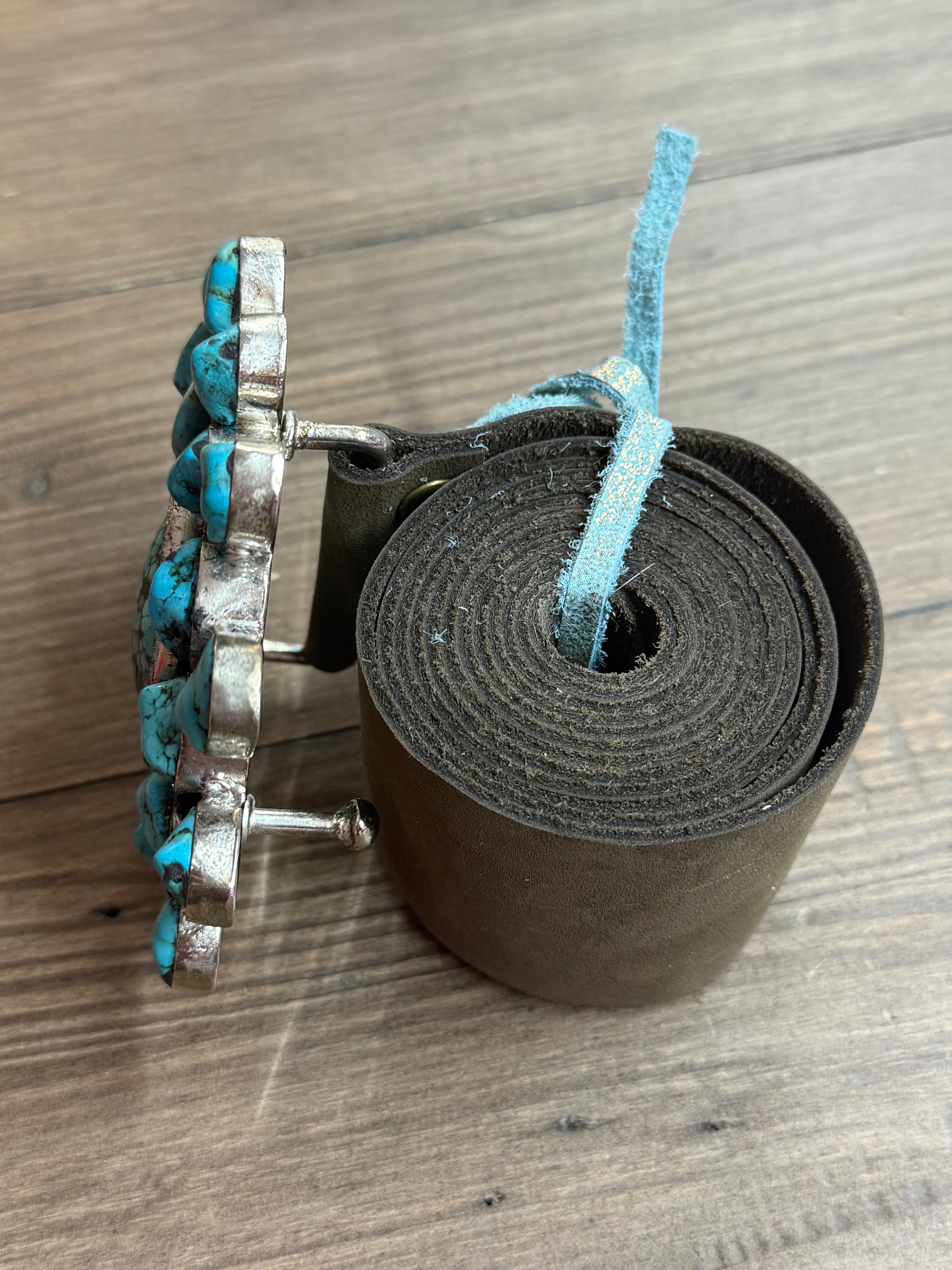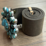 Handcrafted in Magnolia, Texas, this brown cowhide leather belt features authentic turquoise stone detailing. Each piece is created by experienced artisans who understand quality craftsmanship, resulting in a distinctive accessory that combines traditional leather work with striking southwestern-inspired embellishments.